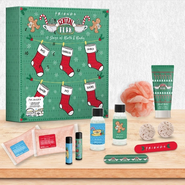 La période de l'Avent n'a jamais été aussi excitante et quelle meilleure façon de la célébrer qu'avec ce calendrier de l'Avent "12 Days of Bath" inspiré de l'univers Friends !Derrière chaque porte se cache un délicieux produit pour le corps :Ce calendrier contient 2 x 30 ml de gel douche au chèvrefeuille et à la rose, 2 x 50 g de sels de bain à la framboise dorée et au chèvrefeuille, 1 x baume pour les lèvres à la fraise, 1 x baume à lèvres à la vanille, 2 x 20 g de pétillants de bain au caramel, 1 x 25 ml de crème pour les mains au chèvrefeuille et à la rose, 2 limes à ongles imprimées et 1 éponge pour le corps en polyester.Vous allez adorer ce calendrier de l'Avent de Central Perk. Il mesure 22 cm de haut, 35 cm de large et 5 cm de profondeur.