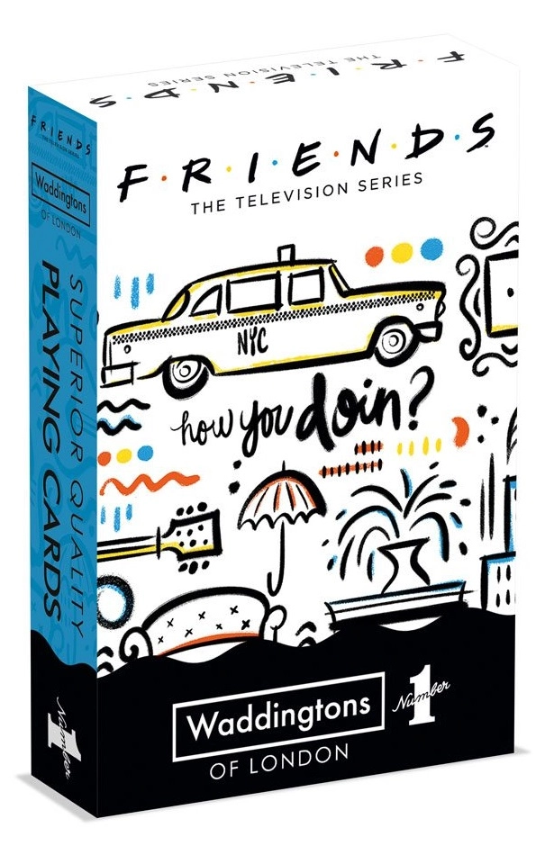 Présentoir de 12 jeux de 54 cartes à jouer haute qualité sous licence officielle.Joey, Chandler, Monica et les autres s'invitent sur votre jeu de 54 cartes ! Avec Waddingtons Number 1, retrouvez les héros de vos univers préférés dans les classiques jeux de 54 cartesContenu :- 54 cartes sur le thème de F.R.I.E.N.D.S. (52 cartes assorties + 2 jokers).- Taille des cartes : 58mm x 88mm