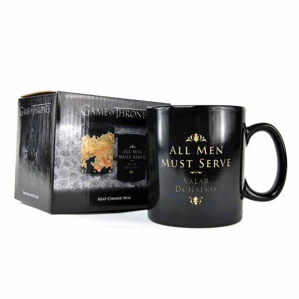 Cette tasse thermo-adhésive Game of Thrones Westeros vous permettra de bien commencer la matinée. Froide, la tasse montre la phrase "Tous les hommes doivent servir" et sa traduction en haut valyrien "Valar Dohaeris" sur le devant, et "Tous les hommes doivent mourir" et sa traduction "Valar Morghulis" au verso. Lorsque le liquide chaud est versé, la tasse se transforme pour révéler les cartes des continents Westeros et Essos. Une fois la boisson terminée, la tasse reprend son état initial en se refroidissant. Un élément essentiel pour tout affichage Game of Thrones.Dimensions: 400 ml - 12,5 (l) x 10 (h) x 9,5 (d) cmEmballage: boîte cadeauComposition: grès