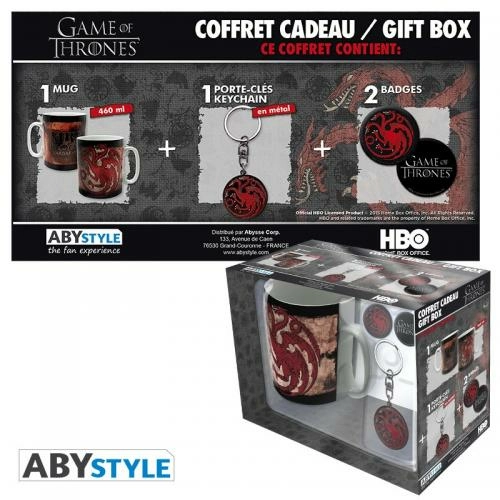 Ce coffret cadeau Game Of Thrones « TARGARYEN » sera le cadeau idéal ! Il contient :- 1 MUG pour boire son thé ou café aux couleurs de son univers préféré. Mug en porcelaine. Grande contenance (460 ml). Résiste à plus de 800 cycles au lave-vaisselle.- 1 PORTE-CLES ultra-stylé pour confier ses clés à ton héros. Porte-clés en métal.- 2 BADGES originaux pour personnaliser ses sacs ou vêtements. Dimensions : diam.35mm.Packaging PVC transparent pour permettre une vue globale des produits.