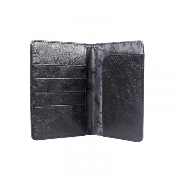 Que vous skiez à Winterfell ou que vous passiez l'été à Highgarden, ce porte-passeport en similicuir Game of Thrones est l'endroit idéal pour un passeport en toute sécurité. Avec la carte Westeros à l'extérieur, il y a de la place pour un passeport, 4 cartes et une autre pochette pour les billets, la documentation ou les billets de banque. La doublure comporte un motif répété des sigils de diverses maisons.Dimensions: 11 (l) x 15 (h) x 1 (d) cmEmballage: boîte cadeauComposition: PU et nylon