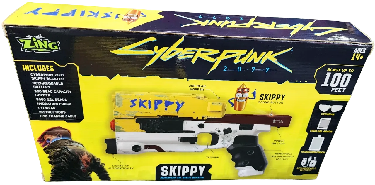 Réplique grandeur nature de Skippy de Cyberpunk 2077 sous forme de Gel Blaster, qui est fournie avec lunettes de protection, 10 000 billes de gel, un pack d'hydratation et une batterie rechargeable. La réplique est entièrement fonctionnelle et vous permet de tirer de petites billes de gel.