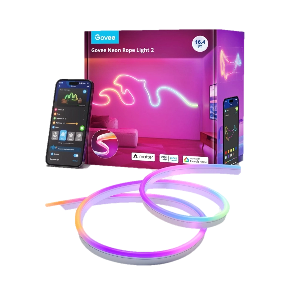 Formez vos propres designs lumineux avec cette bande LED néon RGBIC flexible compatible Matter. 64 modes et 12 modes musicaux inclus, contrôle via appli, voix ou boîtier.