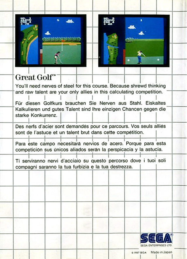 Swing, putter, Eagle et Triple Boogie, plus aucun terme technique n'aura de secret pour vous lorsque vous aurez goûté à Great Golf sur Master System. Les compétitions en 18 trous mettent vos nerfs à rude épreuve dans un sport où chaque détail compte, du sens du vent au type de terrain. A vos Swings.
