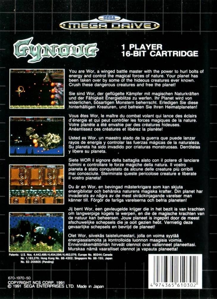 Gynoug est un shoot'em up sur Megadrive. Vous incarnez Wor, un membre des hommes volants dont la planète a été ravagée par un dangereux virus qui a transformé les habitants en mutants. Wor devra, au cours des six niveaux du jeu, détruire tous ces mutants en lançant des boules de feu. La puissance et la défense de Wor peuvent être renforcées en ramassant de multiples bonus.