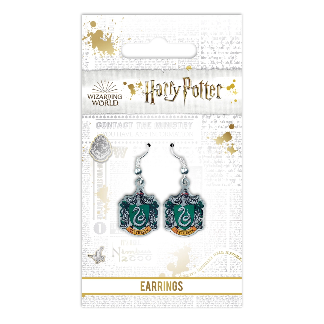 L'écusson de la célèbre maison de Poudlard, fondée par Salazar Serpentard.Chaque boucle d'oreille mesure environ 20 mm de large et 43 mm de long.Ces boucles d'oreilles sont livrées dans un emballage cartonné officiel de la marque Harry Potter.Les boucles d'oreilles sont plaquées argent.