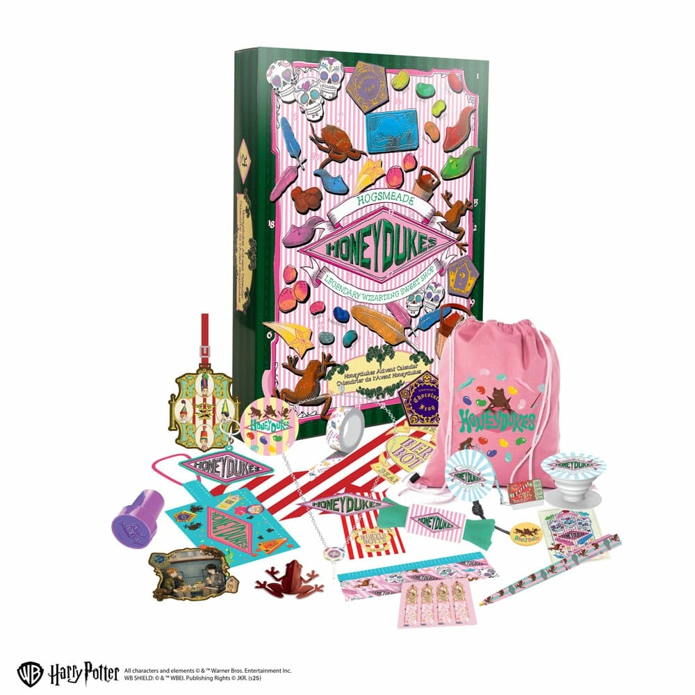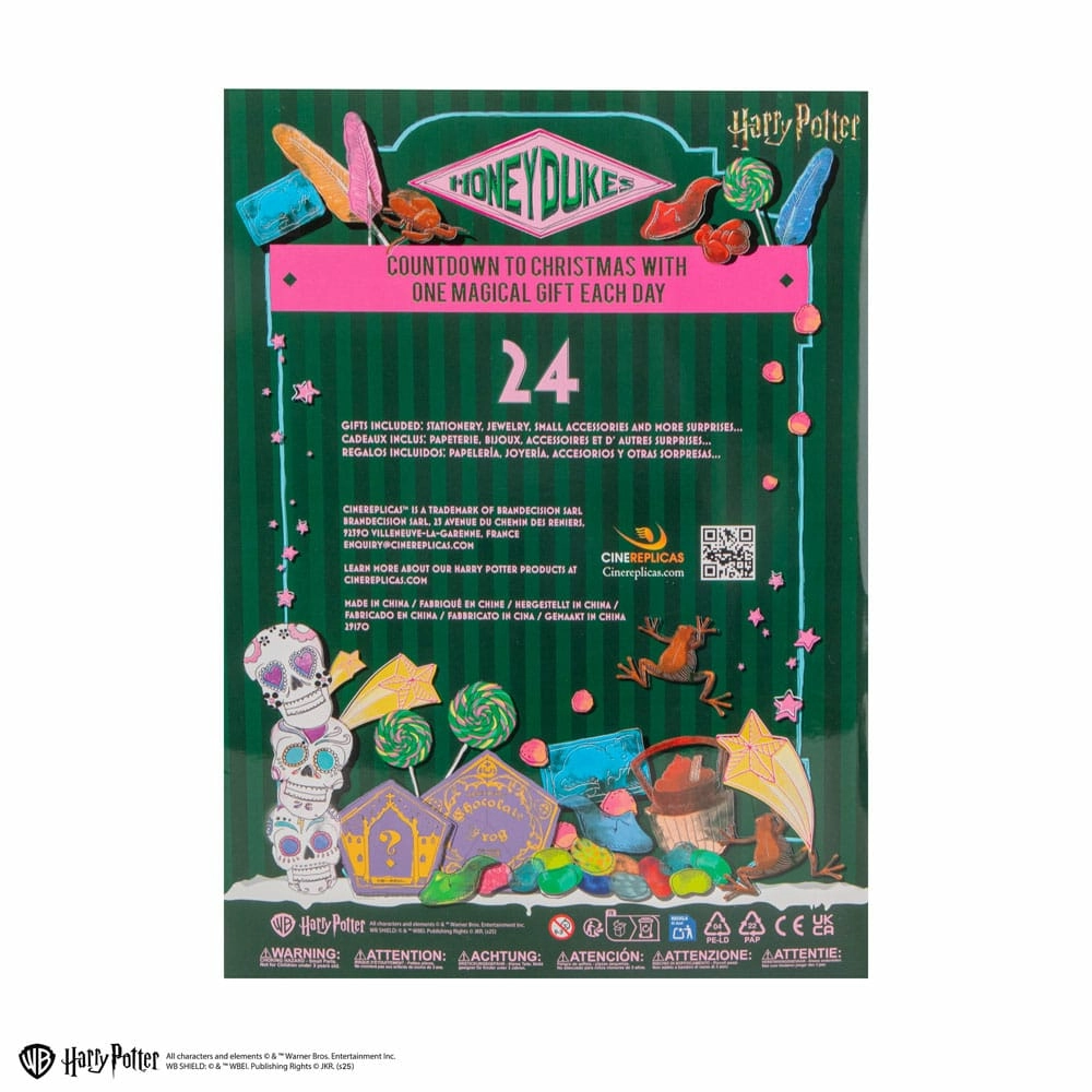 Calendrier de l'Avent sous licence officielle avec 24 articles cadeaux sur le thème Harry Potter (Chaussettes, pochette à cordon, surligneur, porte-clés en caoutchouc, bracelet, autocollant, sac à provisions, collier, ruban washi, badge lenticulaire, onglet mémo, tampon pour enfants, règle, stylo, gomme, douille, épingle, patch tissé, puzzle, ruban de mesure, ornement en acrylique, aimant en mousse, étiquette de bagage, marque-page aimanté)