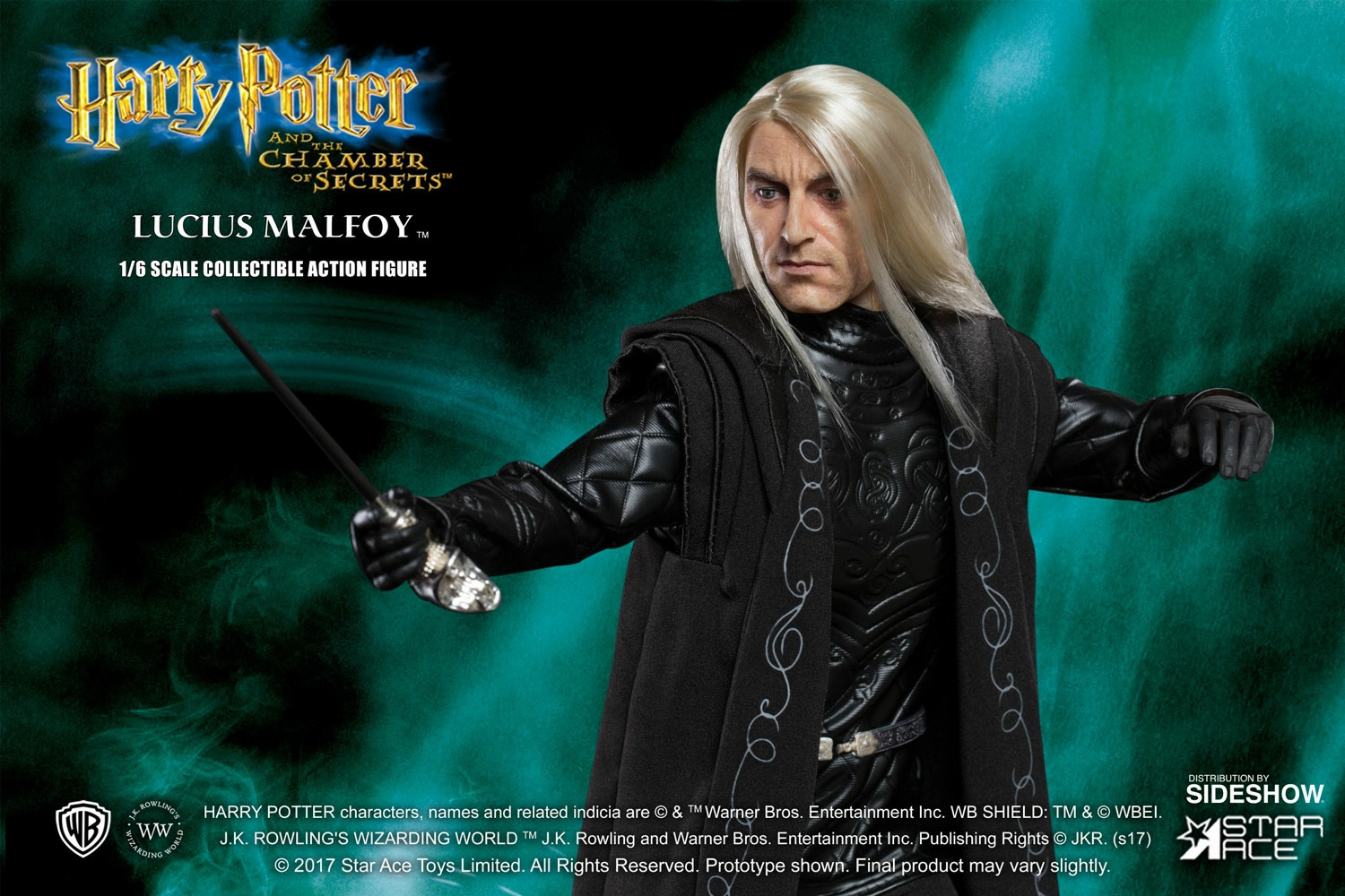 Star Ace présente son dernier méchant dans la sixième ligne de figurines à collectionner d'Harry Potter, Lucius Malfoy, le père de la Némésis d'Harry. Cette figurine à collectionner précise présente des cheveux réalistes et une ressemblance authentique de Jason Isaacs avec Lucius Malfoy vu dans Harry Potter et la Chambre des Secrets. Il vient avec son masque et ses robes de Mangemort et sa baguette à tête de serpent cachée dans sa canne.