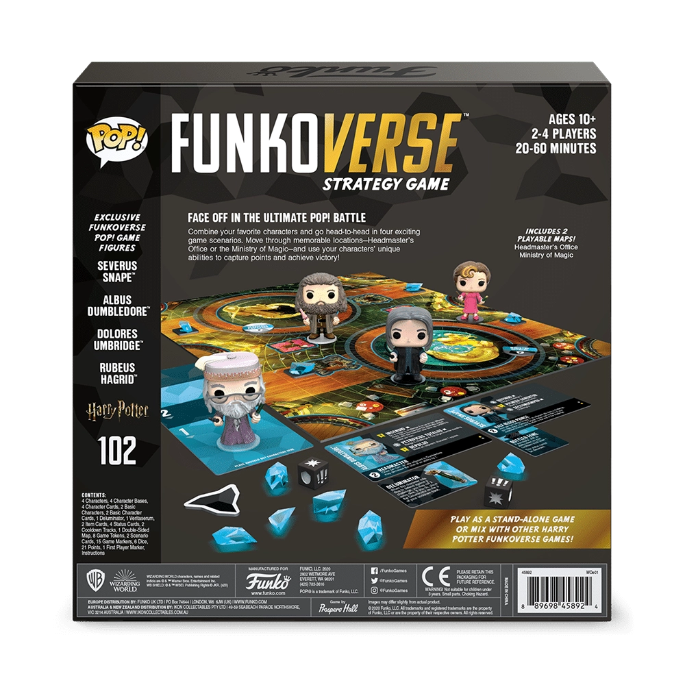 Dans le jeu de stratégie Funkoverse, vous associez vos personnages préférés et vous vous affrontez dans des scénarios de jeu passionnants. À chaque tour, vous sélectionnez un de vos personnages et effectuez deux actions. Chaque personnage a accès à des actions de base comme les déplacements et les défis, ainsi qu'à plusieurs capacités uniques qui ne peuvent être exécutées qu'en dépensant des jetons de capacité. Funkoverse utilise un système innovant de "cooldown" - plus la capacité est puissante, plus il faut de temps pour que le jeton de capacité soit à nouveau disponible - les joueurs doivent donc dépenser leurs jetons de capacité à bon escient. Chaque personnage de Funkoverse est unique, les joueurs sont donc encouragés à essayer différentes combinaisons de personnages et d'objets afin de découvrir leurs synergies préférées et leurs stratégies puissantes pour les différents scénarios de jeu.Severus Rogue, Albus Dumbledore, Dolores Umbridge et Rubeus Hagrid partent pour un voyage magique dans Funkoverse, un jeu de plateau stratégique qui ramène les mondes, les personnages et les histoires que vous aimez chez vous pour en profiter encore et encore. Qui allez-vous faire affronter ou allez-vous les faire combattre contre une autre équipe de Funkoverse ?Tranche d'âge : 10 ans et plusJoueurs : 2-4 joueursDurée du jeu : 40 minutes de jeuÉdition anglaise