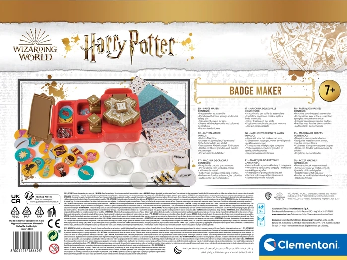 Emportez un peu de la magie de Harry Potter partout avec vous grâce à cette fabrique à badges !De nombreux modèles différents de badges à accrocher aux t-shirts, vestes, trousses, sacs à dos etc. !Insérez simplement la partie avant transparente décorée de dessins, puis la partie arrière, et appuyez pour fermer l'ensemble.Ajoutez l'épingle au dos et vous serez prêt à porter votre création partout !Un jouet qui développe la créativité et les compétences manuelles chez les enfants.