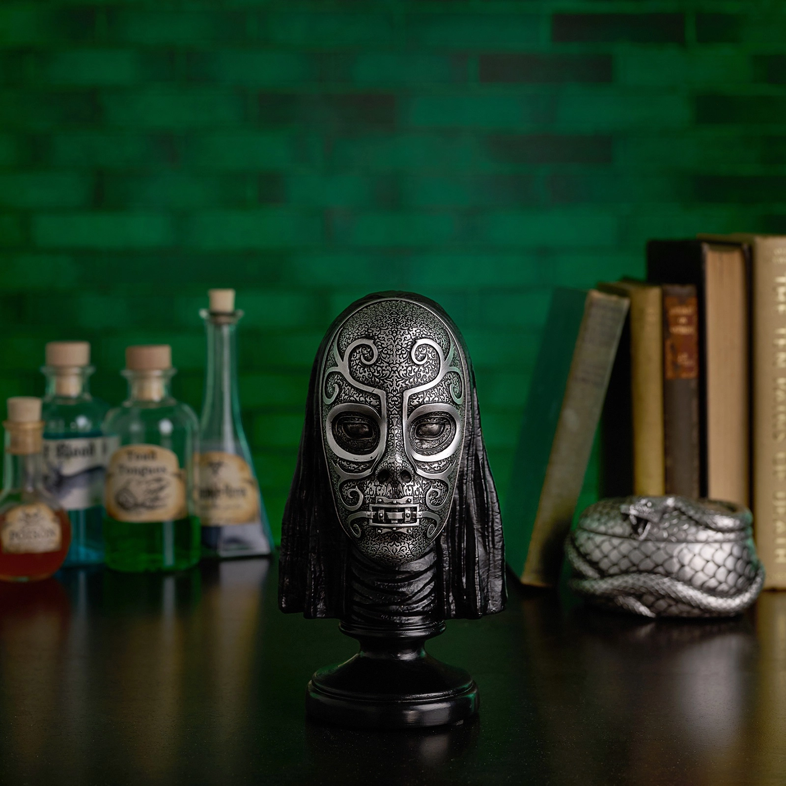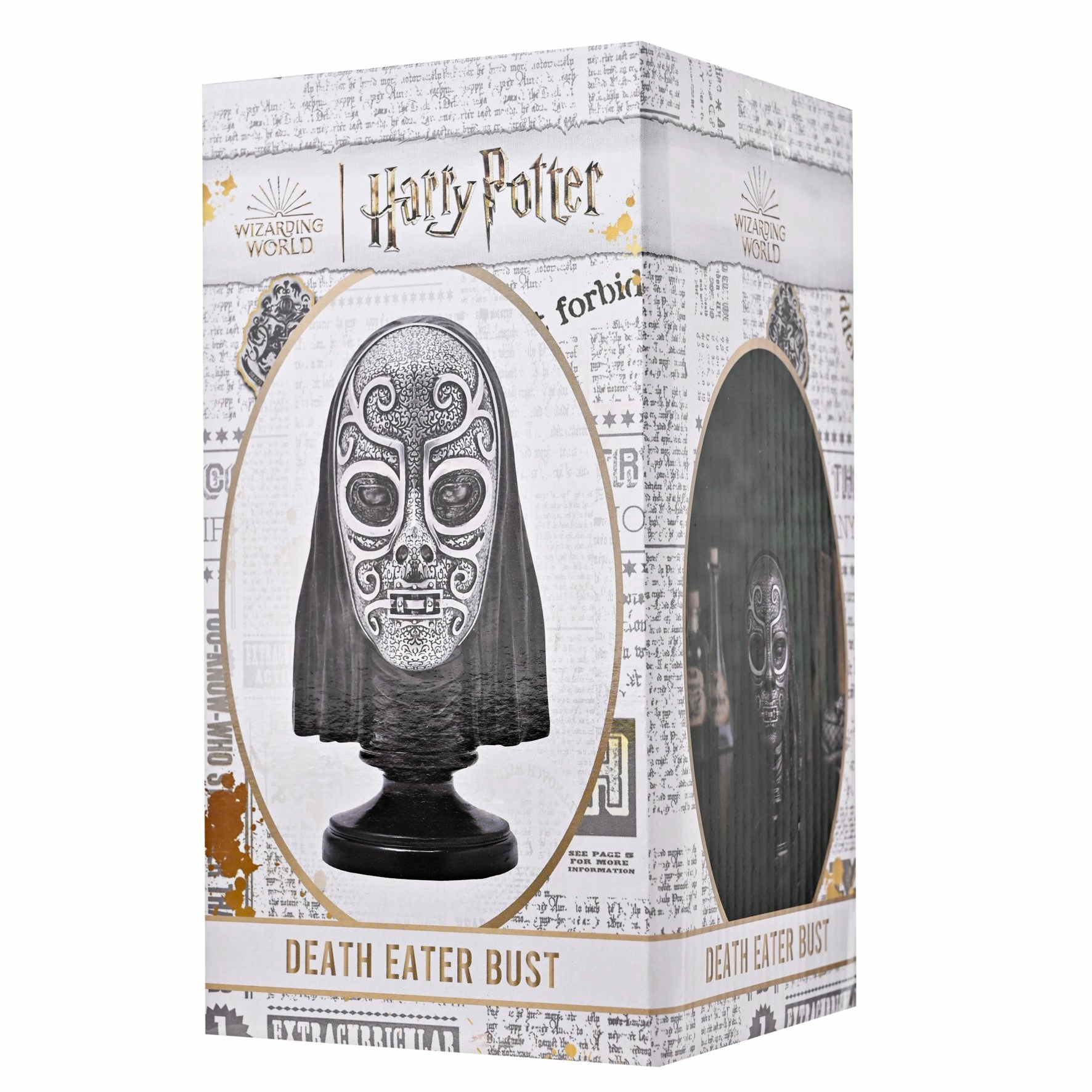 "Plongez dans l'élégance sinistre du monde des sorciers avec la figurine du buste de la magie noire de Warner Bros® Harry Potter - Mangemort. Fabriqué en résine durable avec une finition brillante, cet objet capture l'essence de la magie noire dans un design saisissant et élaboré.Le masque du Mangemort est orné d'embellissements complexes qui évoquent l'attrait mystérieux de la magie noire.Ce buste de Mangemort symbolise les forces inquiétantes du monde des sorciers. Emballage en boîte fermée 4c".
