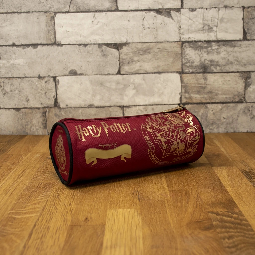 Trousse à crayons écusson de Poudlard. La trousse est ornée d'une impression dorée sur le corps principal et les extrémités. Passepoil noir aux extrémités.