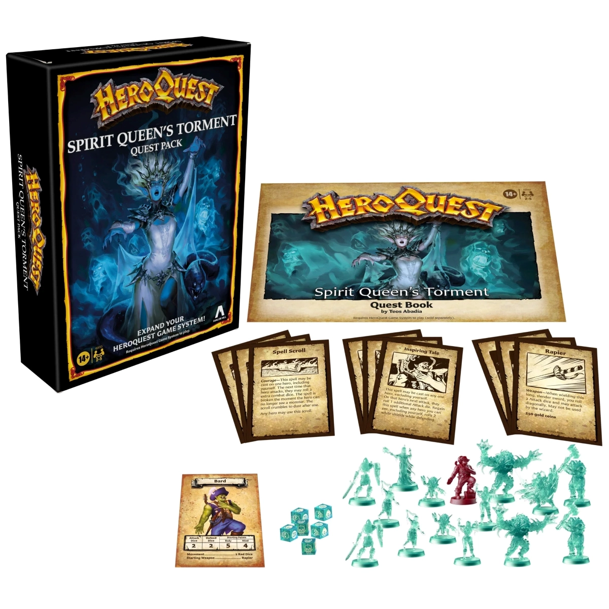 Découvrez une perturbation inhabituelle parmi les esprits et sauvez le royaume du mal ! Dans cette extension HeroQuest Spirit Queen's Torment, revenez à la riche histoire du jeu de société HeroQuest et lancez-vous dans 14 quêtes palpitantes ! La sage elfe Silvana, brillante devin et alliée de Mentor, a eu des visions d'esprits entourant son défunt apprenti bien-aimé, Nelath, une causeuse d'esprit tuée par Zargon. En incarnant l'un des héros courageux de HeroQuest, vous devez entrer dans le donjon de Wyvern et mettre fin à tout complot ignoble qui a perturbé le sommeil éternel de Nelath, avant qu'un sort pire que la mort ne lui arrive. Plongez-vous dans la fantaisie avec 15 miniatures détaillées, 15 cartes de jeu et livre de quêtes magnifiquement illustrés, et 6 dés. (Nécessite le système de jeu HeroQuest pour jouer. Vendu séparément.) Ce jeu offre une rejouabilité illimitée et vous pouvez également créer vos propres quêtes et histoires. Rassemblez vos amis pour une bataille épique entre le bien et le mal. Pour 2 à 5 joueurs, à partir de 14 ans.Vous pouvez désormais étendre votre système de jeu HeroQuest avec ce pack de quêtes Spirit Queen's Torment, autrefois disponible uniquement dans le cadre du package HeroQuest : Haslab Mythic Tier (nécessite le système de jeu HeroQuest pour jouer. Vendu séparément.)En tant que héros barde, révélez une perturbation parmi les esprits et trouvez la Reine des Esprits pour mettre fin au complot maléfique de Zargon ! Les 15 cartes de jeu et le livre de quêtes présentent des illustrations qui vous plongent dans un monde déchirant.Cette extension de jeu de société sur table comprend 15 miniatures non peintes finement détaillées, dont le héros barde et les miniatures du monstre turquoise fantomatique.Le livre de quêtes Spirit Queen's Torment, écrit par Teos Abadia, comprend 14 quêtes, se déroulant dans des lieux périlleux remplis de monstres, de trésors, de sorts et de secrets magiques cachés.Plongez plus profondément dans le monde de HeroQuest avec ce pack d'extension qui ajoute à la rejouabilité du jeu. Les joueurs peuvent également créer leurs propres histoires et concevoir leurs propres quêtes.Ce pack d'extension HeroQuest est un excellent cadeau pour les fans de jeux coopératifs, de jeux de société fantastiques et de jeux d'aventure. Pour 2 à 5 joueurs, à partir de 14 ansComprend un livre de quêtes comprenant 14 quêtes, 15 miniatures finement détaillées, 15 cartes de jeu et 6 dés.VERSION FRANÇAISE