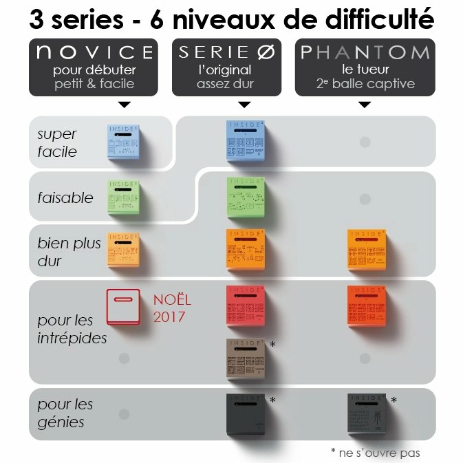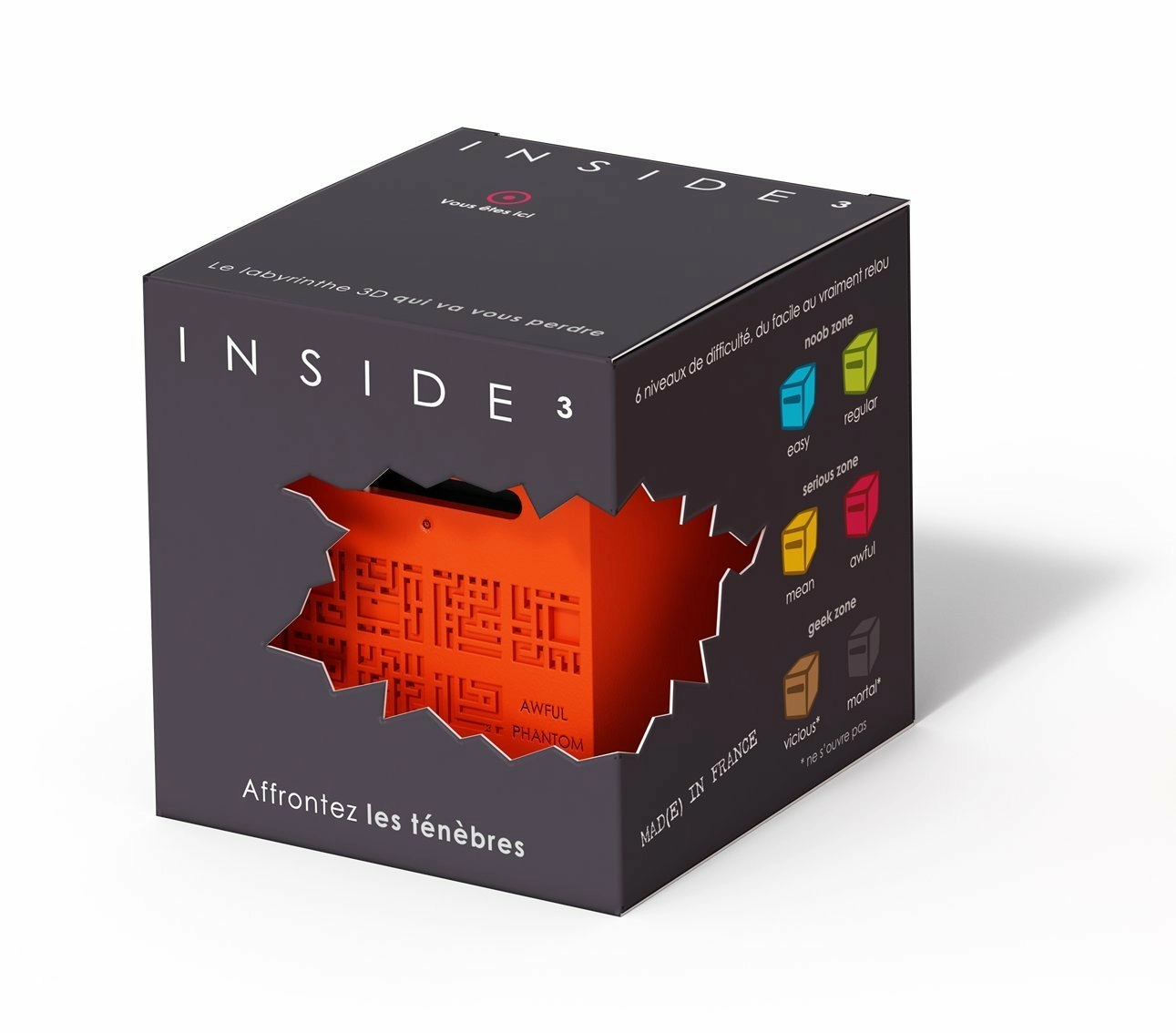 Inside 3 n'est pas vraiment un casse tête, c'est une aventure dans les ténèbres. On libère la bille et on la regarde disparaître dans les tréfonds du cube. Après il faut la guider en s'aidant de tous ses sens et du plan gravé en surface pour la faire traverser le labyrinthe jusqu'à la fin ! Attention, les 3 modèles les plus difficiles ne sont pas démontables. Une gamme complète et progressive de 12 modèles, pour apprendre au fur et à mesure et améliorer ses capacités à se représenter l'espace. Le premier modèle (easy noVICE) peut se jouer à partir de 8 ans. Les derniers modèles (le Moratl 0 et le Cthulhu Phantom) devraient franchement être interdits à la vente !