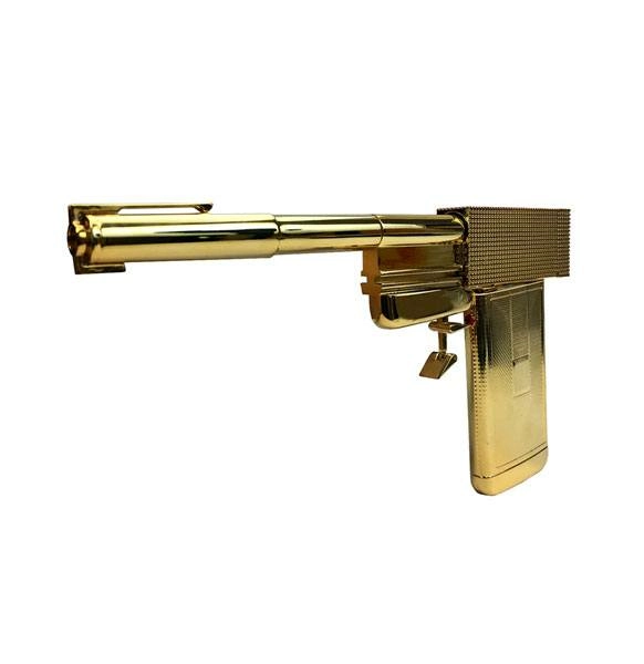 Réplique à l´échelle 1/1 taille env. 24 cm du pistolet de Francisco Scaramanga (Christopher Lee) dans le film L´Homme au pistolet d'or.Modèle en métal usiné plaqué or 24 cts pouvant être démonté pour retrouver ses constituants d´origine, comme dans le film (sylo plume, briquet, étui à cigarettes, bouton de manchette, balle). Edition limitée numérotée en présentoir avec couvercle acrylique, livret descriptif et certificat d´authenticité.