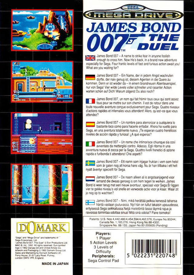 James Bond The Duel 007 sur Megadrive est un jeu de plates-formes vous permettant d'incarner le célèbre agent secret britannique. Comme toujours, Bond affronte un professeur mégalomane qui tente de mettre le monde à sa merci. Durant ses péripéties, 007 fera de nombreuses rencontres, certaines douloureuses comme Jaws, d'autres plus heureuses comme les James Bond Girls.