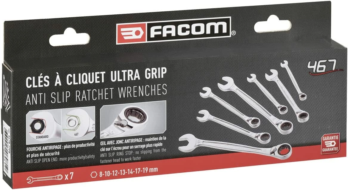 FACOM Jeu de 7 Clés Mixtes à Cliquet Métriques 8 à 19 mm :Système Ultra-Grip Antidérapant,Mécanisme à Cliquet Compact Réversible par Le... Lire plus