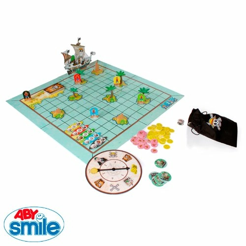 CONTENU : 1 Plateau de Jeu , 5 pions personnages Luffy ,1 Roulette, 1 flèche (à disposer sur la roulette), 1 sac en tissu pour lespions personnages : 5 Zoro, 5 Nami et 5 Usopp, 1 Vogue Merry , 33 cartes Actions, 50 pièces d'or "Berrys", 30 pions"morceaux de viande", 5 lanceurs, 8 îles avec leurs accessoires, 1 règle du jeu