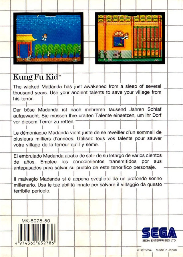 Kung Fu Kid sur Master System est un jeu d'action/beat'em all où vous devez traverser 7 niveaux avant d'atteindre le boss final.