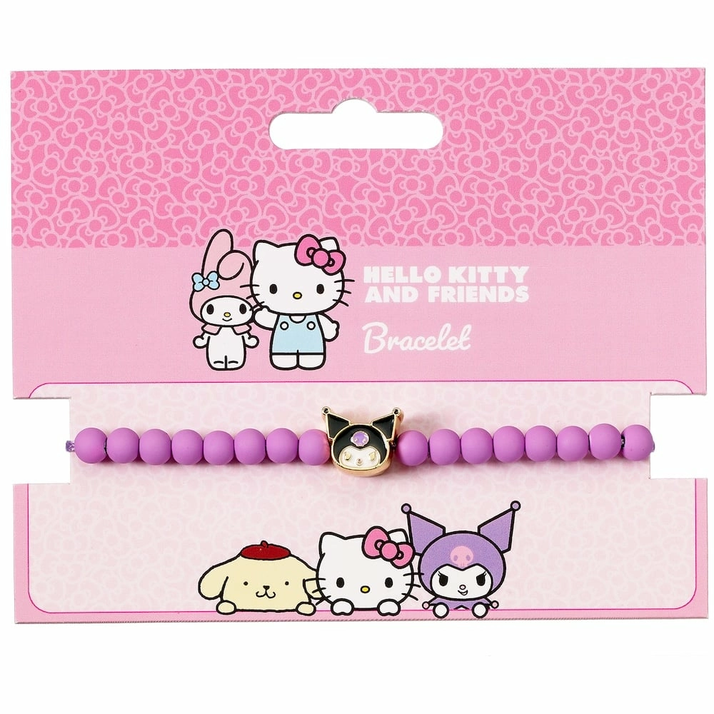 Adoptez le charme espiègle de Kuromi avec ce bracelet Hello Kitty ludique ! Composé de perles violettes mates et d'un joli charm en émail, il s'ajuste facilement pour s'adapter aux poignets de 17 à 21 cm. Parfait pour les fans âgés de 14 ans et plus, cet accessoire sous licence officielle apporte une touche fun et punk à votre look.