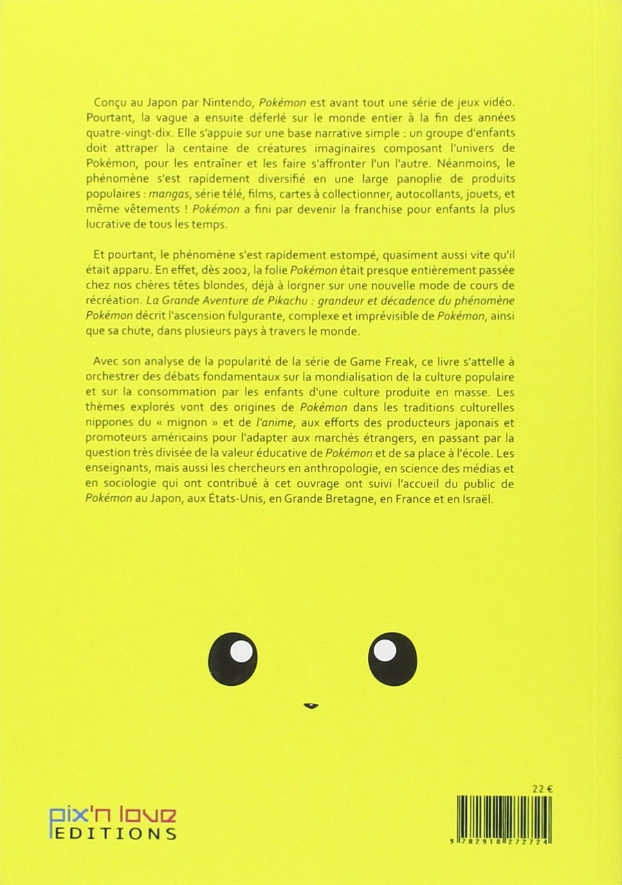 Conçu au Japon par Nintendo, Pokémon est avant tout une série de jeux vidéo. Pourtant, la vague a ensuite déferlé sur le monde entier à la fin des années quatre-vingt-dix. Elle s'appuie sur une base narrative simple : un groupe d'enfants doit attraper la centaine de créatures imaginaires composant l'univers de Pokémon, pour les entraîner et les faire s'affronter l'un l'autre. Néanmoins, le phénomène s'est rapidement diversifié en une large panoplie de produits populaires : mangas, série télé, films, cartes à collectionner, autocollants, jouets, et même vêtements ! Pokémon a fini par devenir la franchise pour enfants la plus lucrative de tous les temps. Et pourtant, le phénomène s'est rapidement estompé, quasiment aussi vite qu'il était apparu. En effet, dès 2002, la folie Pokémon était presque entièrement passée chez nos chères têtes blondes, déjà à lorgner sur une nouvelle mode de cours de récréation. La Grande Aventure de Pikachu : grandeur et décadence du phénomène Pokémon décrit l'ascension fulgurante, complexe et imprévisible de Pokémon, ainsi que sa chute, dans plusieurs pays à travers le monde. Avec son analyse de la popularité de la série de Game Freak, ce livre s'attelle à orchestrer des débats fondamentaux sur la mondialisation de la culture populaire et sur la consommation par les enfants d'une culture produite en masse. Les thèmes explorés vont des origines de Pokémon dans les traditions culturelles nippones du "mignon" et de l'anime, aux efforts des producteurs japonais et promoteurs américains pour l'adapter aux marchés étrangers, en passant par la question très divisée de la valeur éducative de Pokémon et de sa place à l'école. Les enseignants, mais aussi les chercheurs en anthropologie, en science des médias et en sociologie qui ont contribué à cet ouvrage ont suivi l'accueil du public de Pokémon au Japon, aux Etats-Unis, en Grande Bretagne, en France et en Israël.
