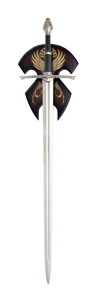Réplique de l´arme de Strider (Aragorn) vue dans le film, avec présentoir.- Taille totale: 120 cm- Longueur lame: 91 cm- Epaisseur lame: 60 mm- Lame non affûtée acier inoxydable 420 J2, finition polie- Poignée métal finition vieil argent, cuir- Présentoir bois- Certificat d´authenticité- Fixations et instructions fournies.Remarque importante : en raison des dimensions de ce produit, des frais de livraison additionnels peuvent s'appliquer. Indépendamment de la localité de livraison, les dimensions de l'emballage et le poids total du produit sont requis pour calculer ces frais éventuels. Ces informations ne sont pas disponibles à ce jour et ne le seront peut-être pas avant la disponibilité du produit.