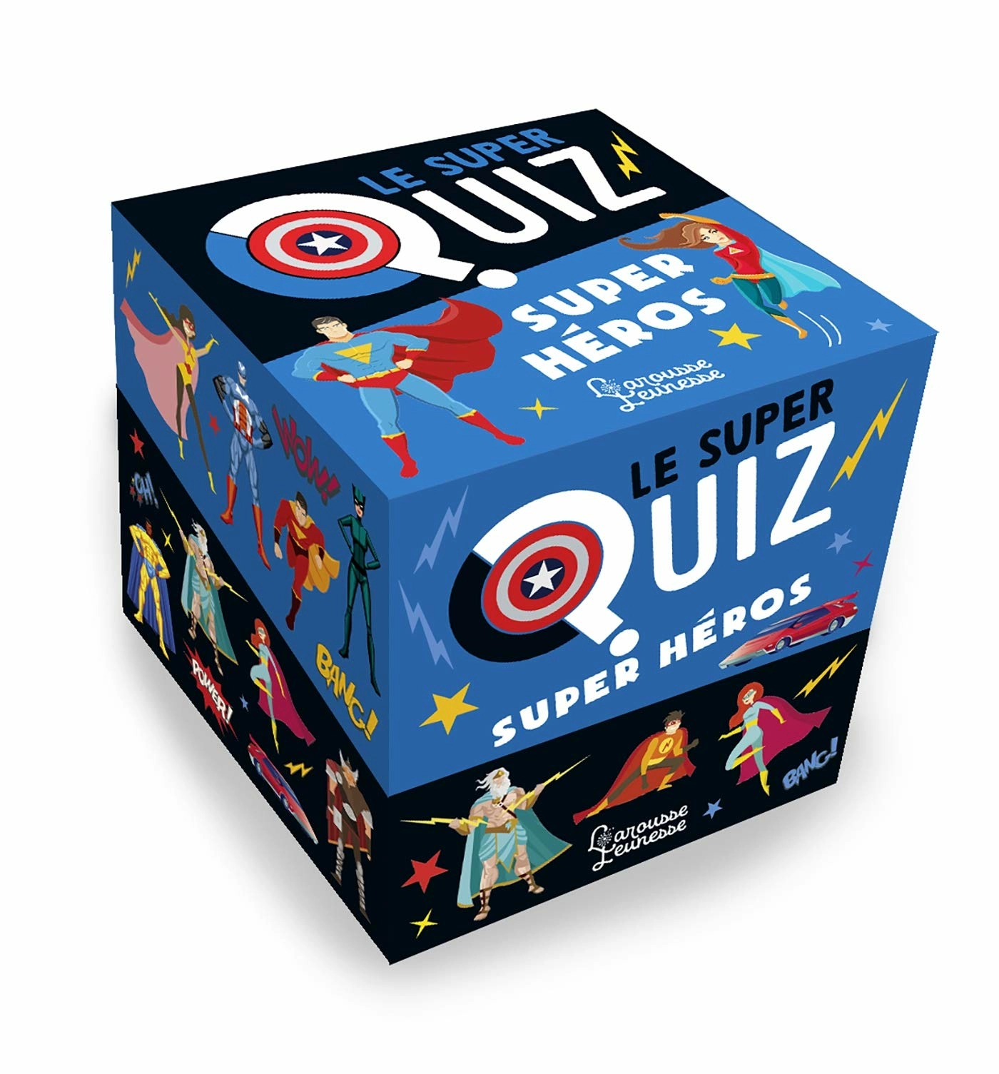 Une boîte en forme de cube qui renferme 250 cartes questions, sur les super héros des plus illustres sagas (Marvel, Star Wars, les mangas, etc.), et tous les plus grands héros mythologiques (mythologie grecque, scandinave, etc.).