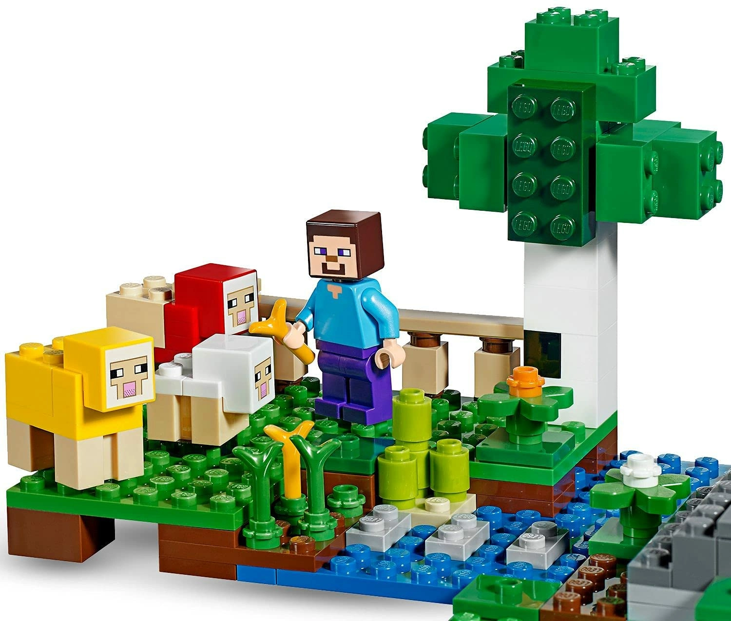 - Le modèle comprend une ferme Minecraft avec un bouleau, une clôture, un ruisseau, des pierres pour le traverser, des cultures, des fleurs, 2 moutons Minecraft teints et un agneau, ainsi que des briques LEGO colorées pour construire l'une des 3 structures amusantes qui décoreront la ferme.