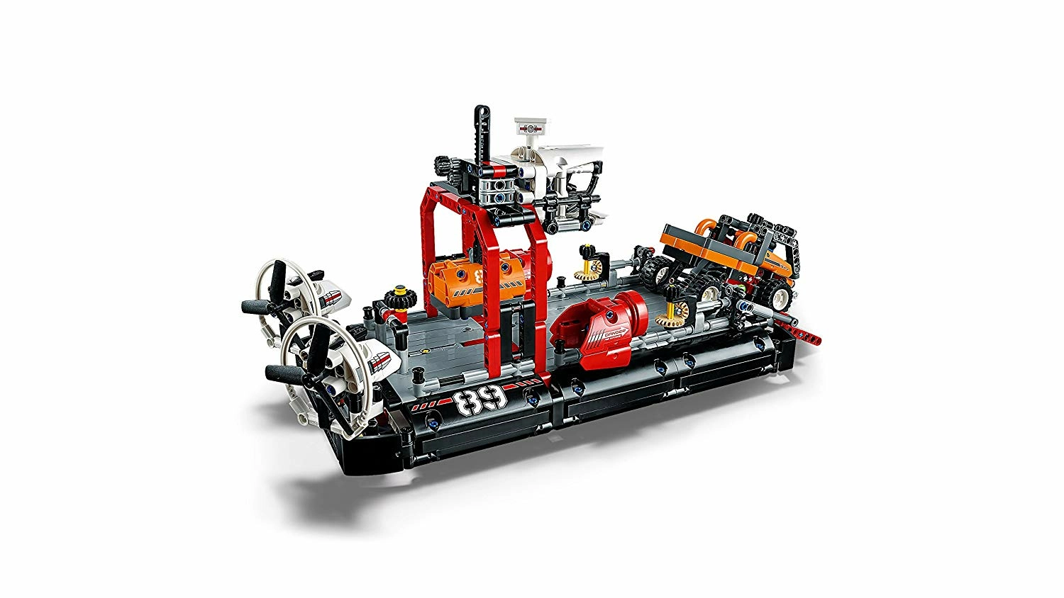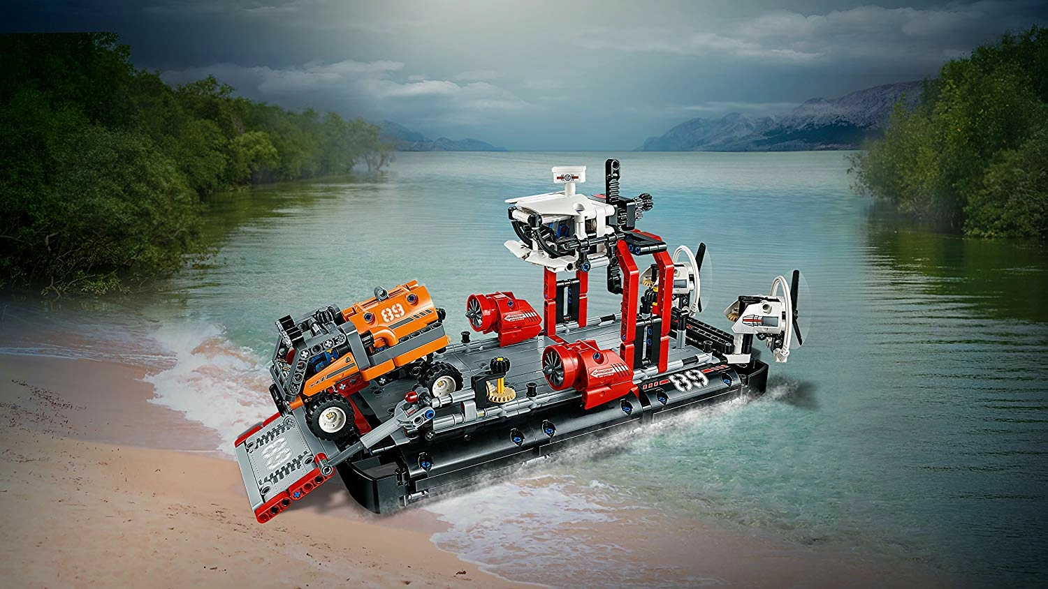 - Construisez un aéroglisseur avec 2 grands ventilateurs arrière rotatifs, une rampe de chargement qui se lève, une direction, une grue fonctionnelles avec une cabine d'opérateur et un camion d'expédition détaillé
