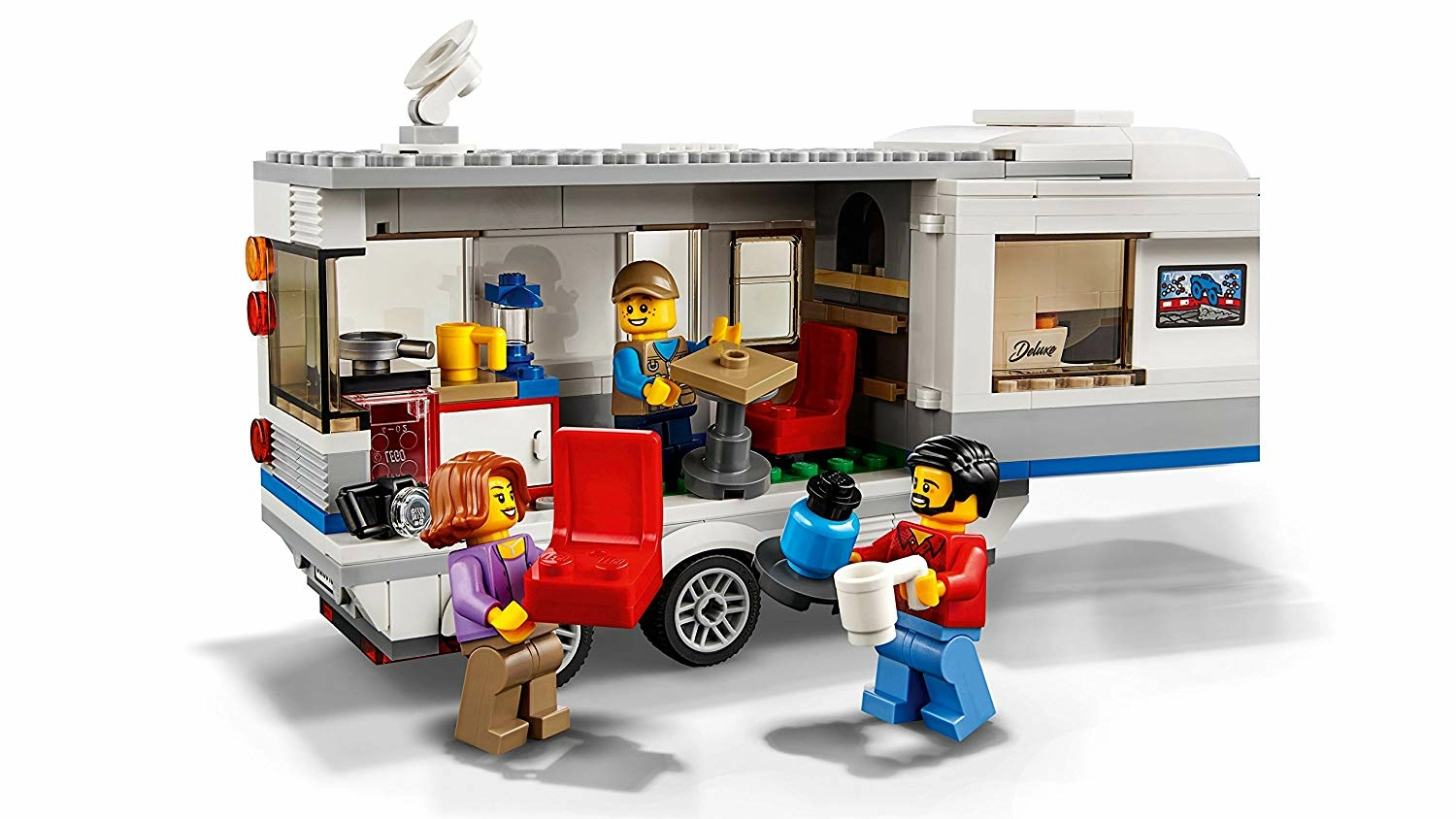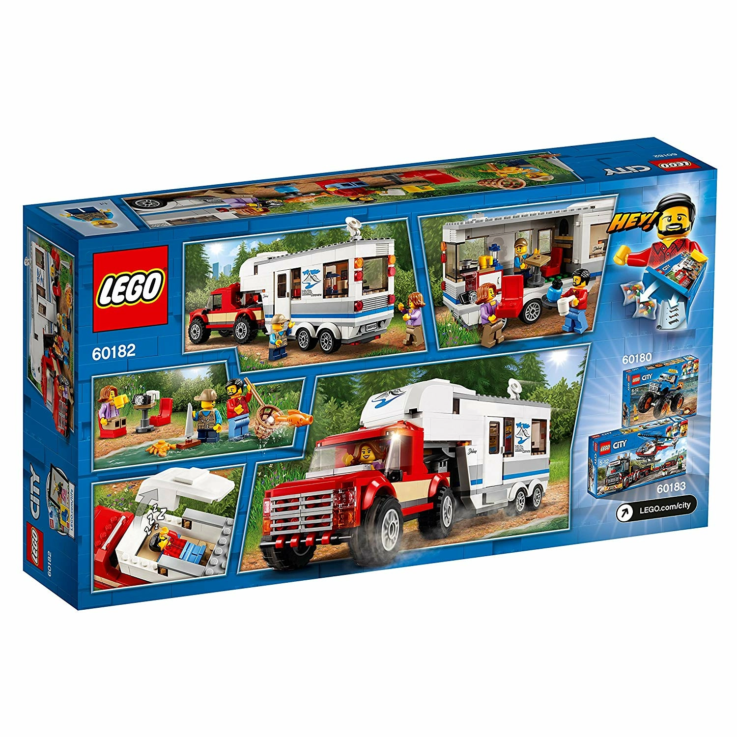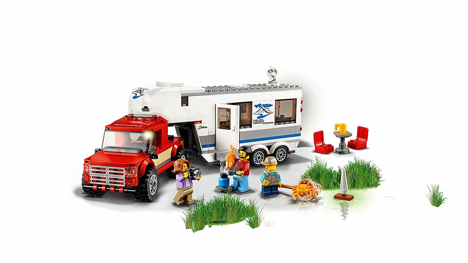C'est parti pour des vacances en famille avec le pick-up et la caravane LEGO City. Cette boîte comprend une grande caravane avec une ouverture latérale, une porte, un toit frontal amovible pour accéder à la chambre, des meubles amovibles, un pied de support séparé ainsi qu’un pick-up au toit amovible et une remorque avec attelage de caravane. Ce jouet inclut 3 figurines et une figurine de crabe.