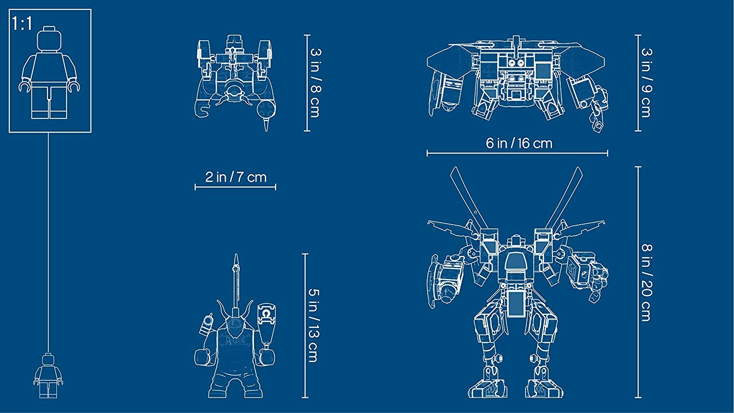- L'hélicoptère Oni mesure plus de 8 cm de haut, 32 cm de long et 10 cm de large ; Le robot Samouraï X mesure plus de 15 cm de haut, 7 cm de long et 8 cm de large, et 22 cm de large avec les bras ouverts ; La grande figurine de Killow mesure plus de 6 cm de haut