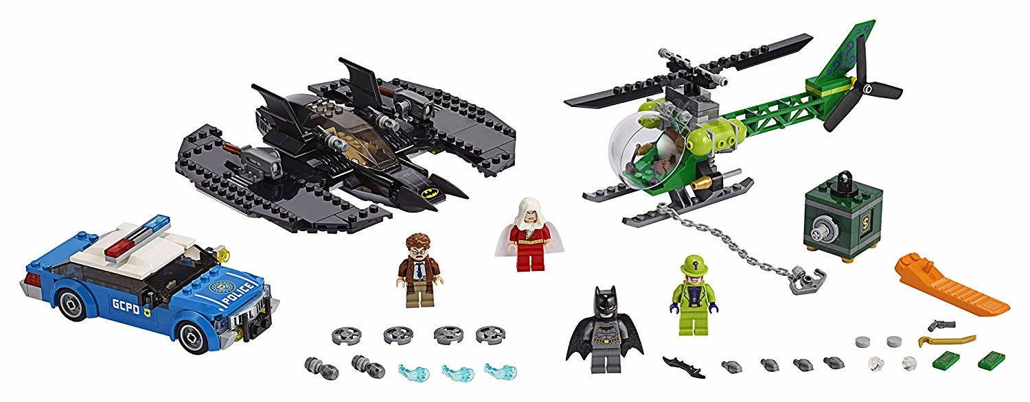 Fonce pour mettre fin au cambriolage de l'Homme-Mystère avec LEGO® Batman™, le Commissaire Gordon™ et SHAZAM!™. Le super-vilain a déverrouillé le coffre-fort volé, l'a accroché à son hélicoptère et a pris la fuite. Poursuis-le avec le puissant Batwing de Batman et la voiture de police du Commissaire Gordon. Évite les missiles de l'hélicoptère et réplique avec les fusils à tirs multiples du Batwing et d'autres armes très sophistiquées. L'action ne connaît pas de limite avec cet excellent jeu de construction. Abats l'hélicoptère et capture l'Homme-Mystère avant qu'il ne s'échappe avec l'argent et les pierres précieuses !