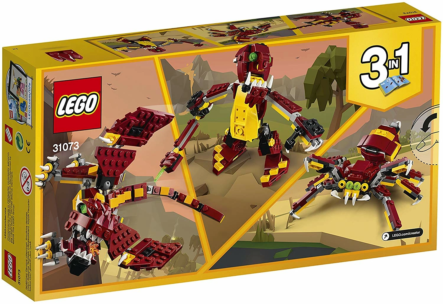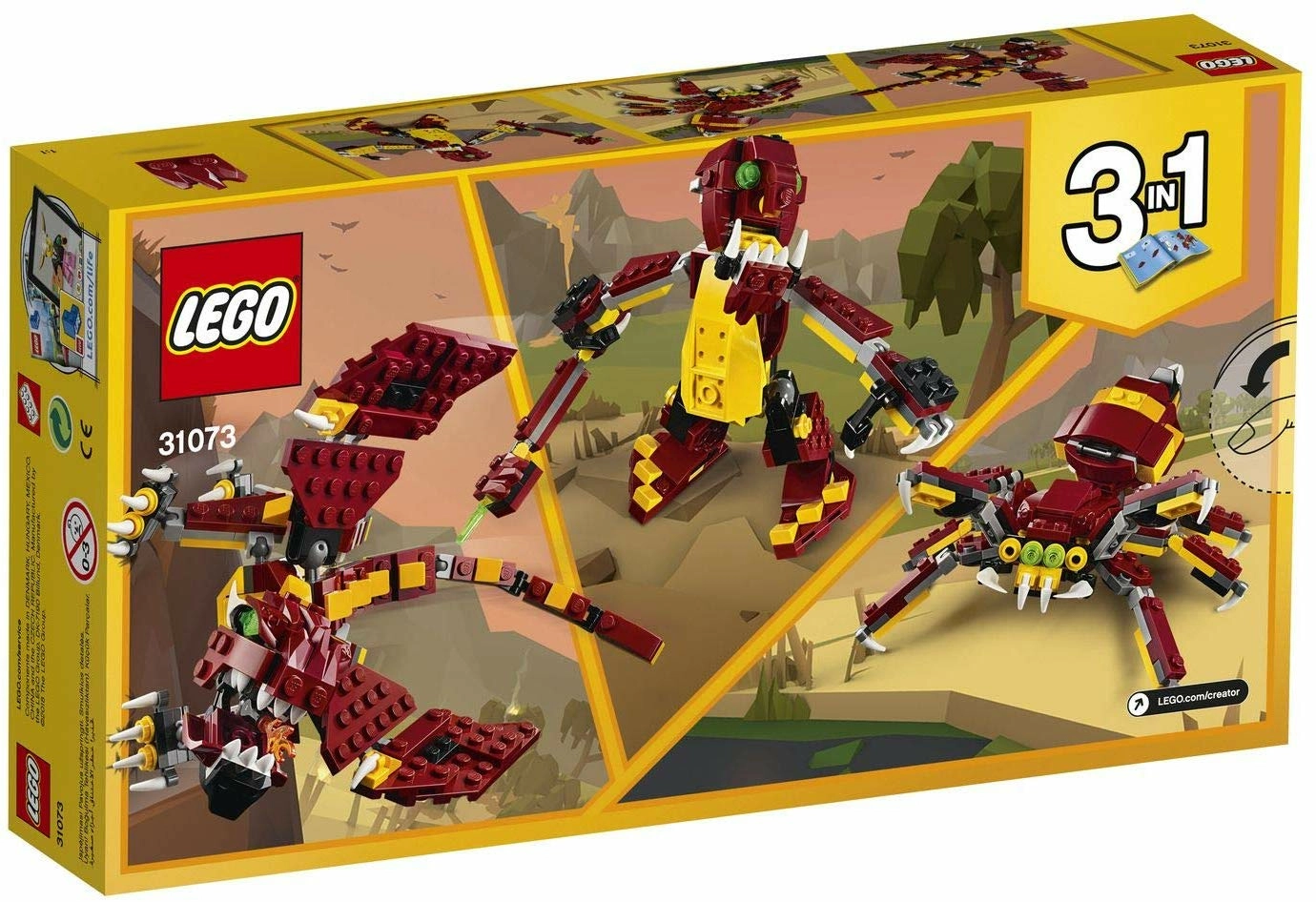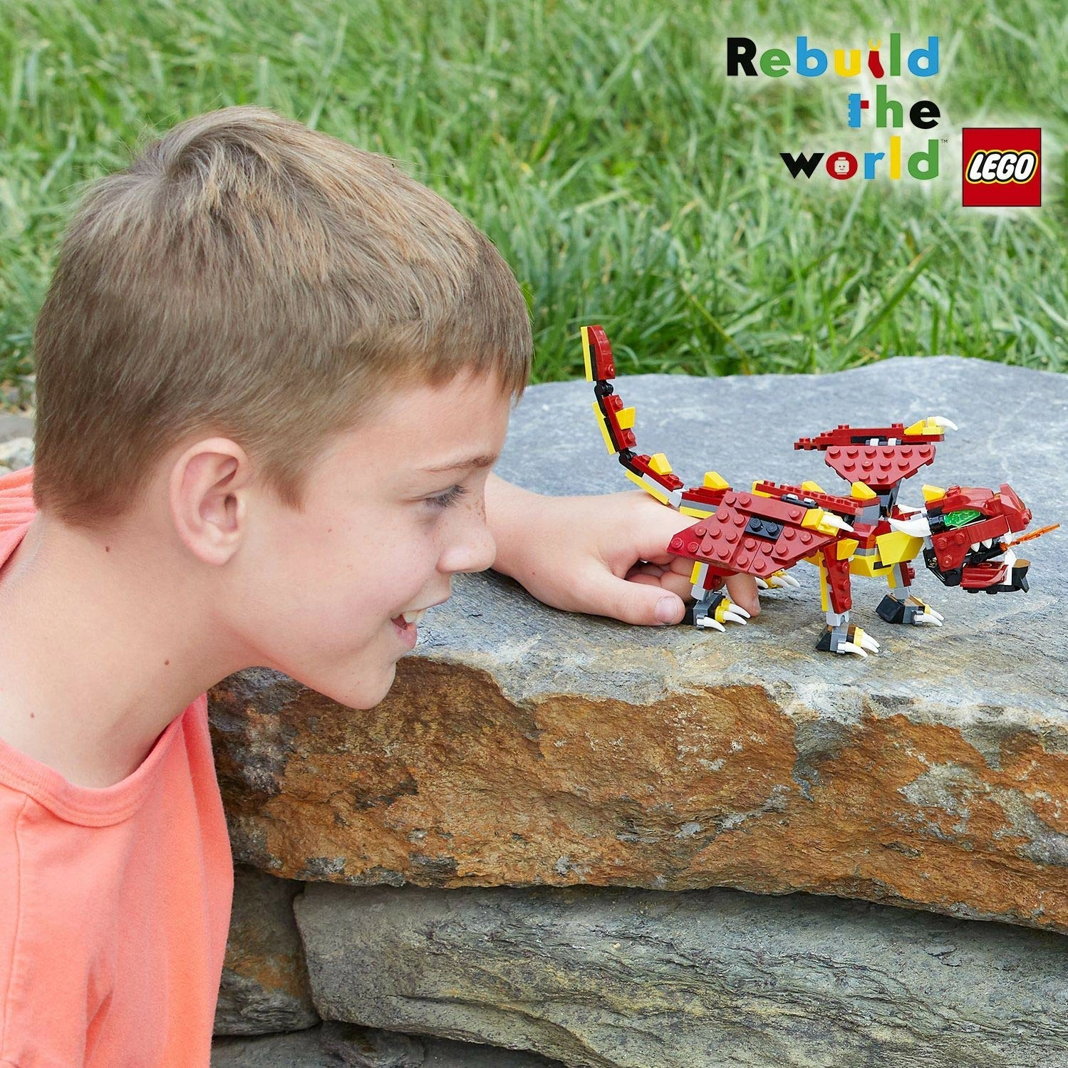 - Construisez les Créatures Mythiques 3-en-1 comprend un dragon cracheur de feu , avec des crocs, des yeux verts, des griffes pointues, ainsi que des mâchoires, une tête, des ailes et une queue mobiles
