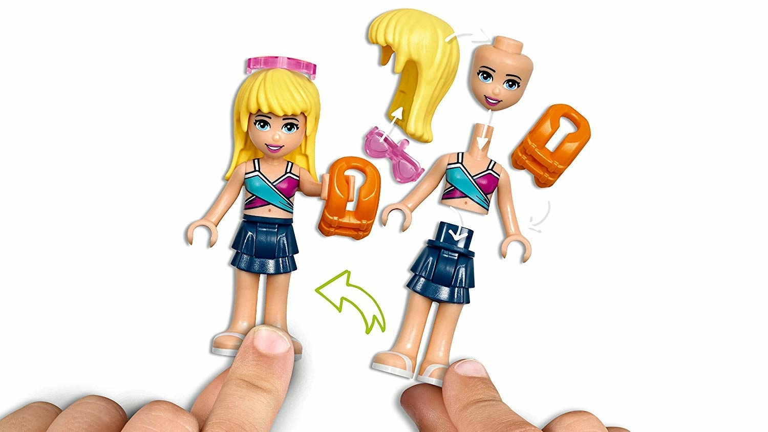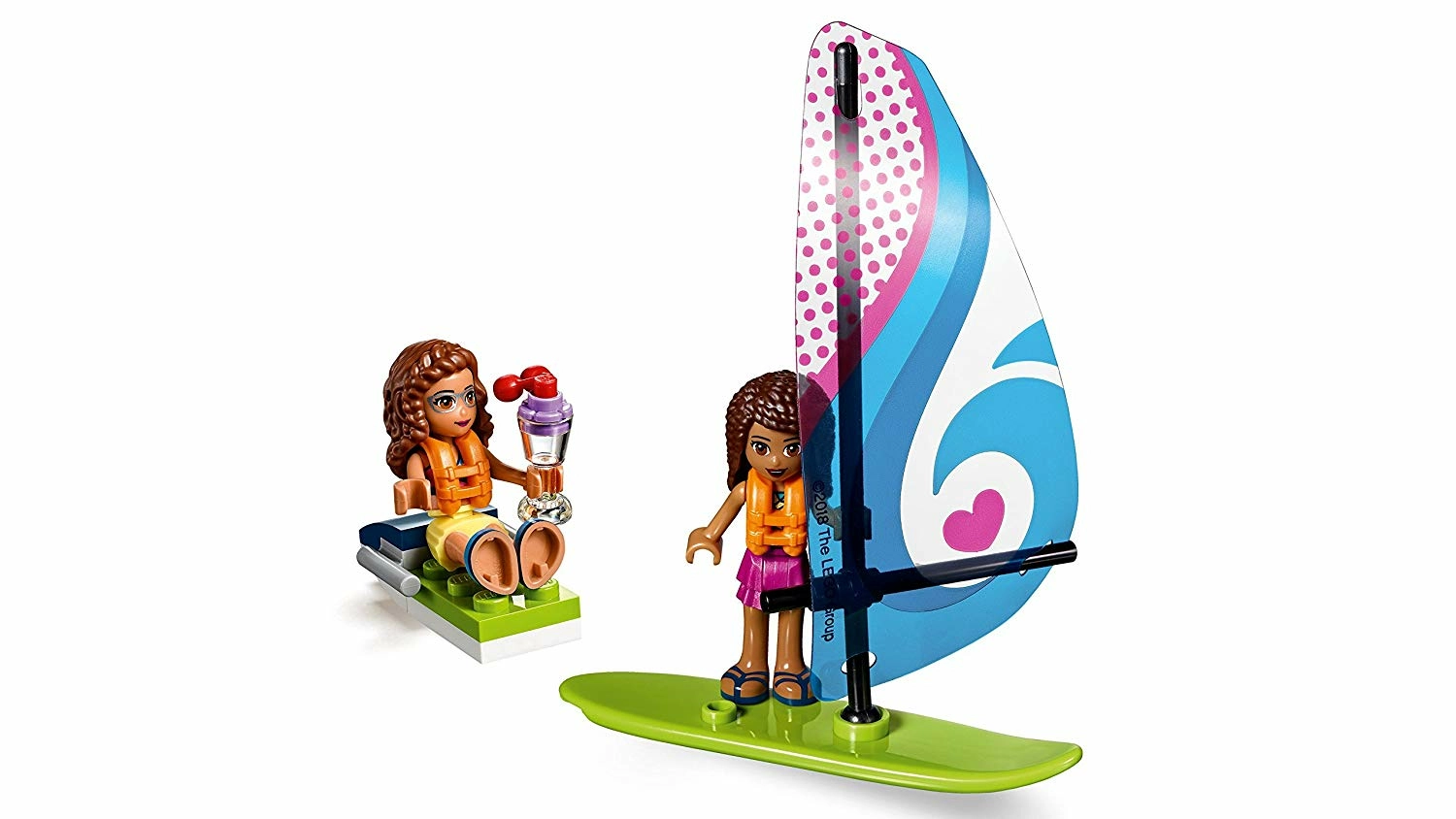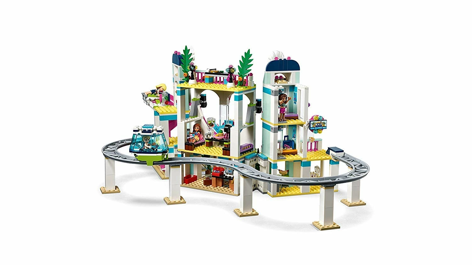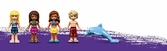 Le complexe touristique d’Heartlake City LEGO Friends est l’endroit à ne pas manquer pour s’amuser dans cette ville ! L’hôtel comprend un hall d’accueil, un restaurant, un bar à jus, une terrasse avec une installation de DJ et 2 chambres. Le monorail permet de faire le tour du parc aquatique équipé d'un vestiaire, de 2 toboggans aquatiques et d'un seau qui se renverse. Une plage avec un scooter des mers, un parachute ascensionnel et un poste de surveillance sont également à découvrir. Ce fantastique ensemble LEGO Friends inclut 4 mini-poupées ainsi qu’une figurine de dauphin.