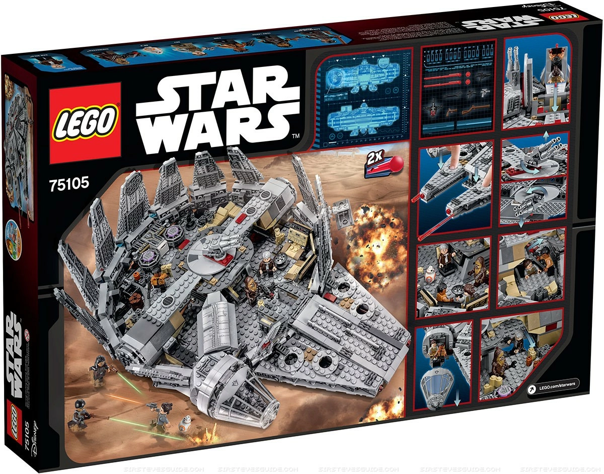 Cette nouvelle version Lego Star Wars du Faucon Millenium, fidèle à son apparence dans l'Episode VII, Le réveil de la Force, dispose d'un nouveau design plus détaillé et de fonctions externes inédites : des doubles fusils à ressorts, un capteur, une rampe, une trappe d'entrée, un cockpit détachable avec de la place pour 2 figurines, des tourelles laser inférieures et supérieures avec une trappe et de la place pour une figurine.