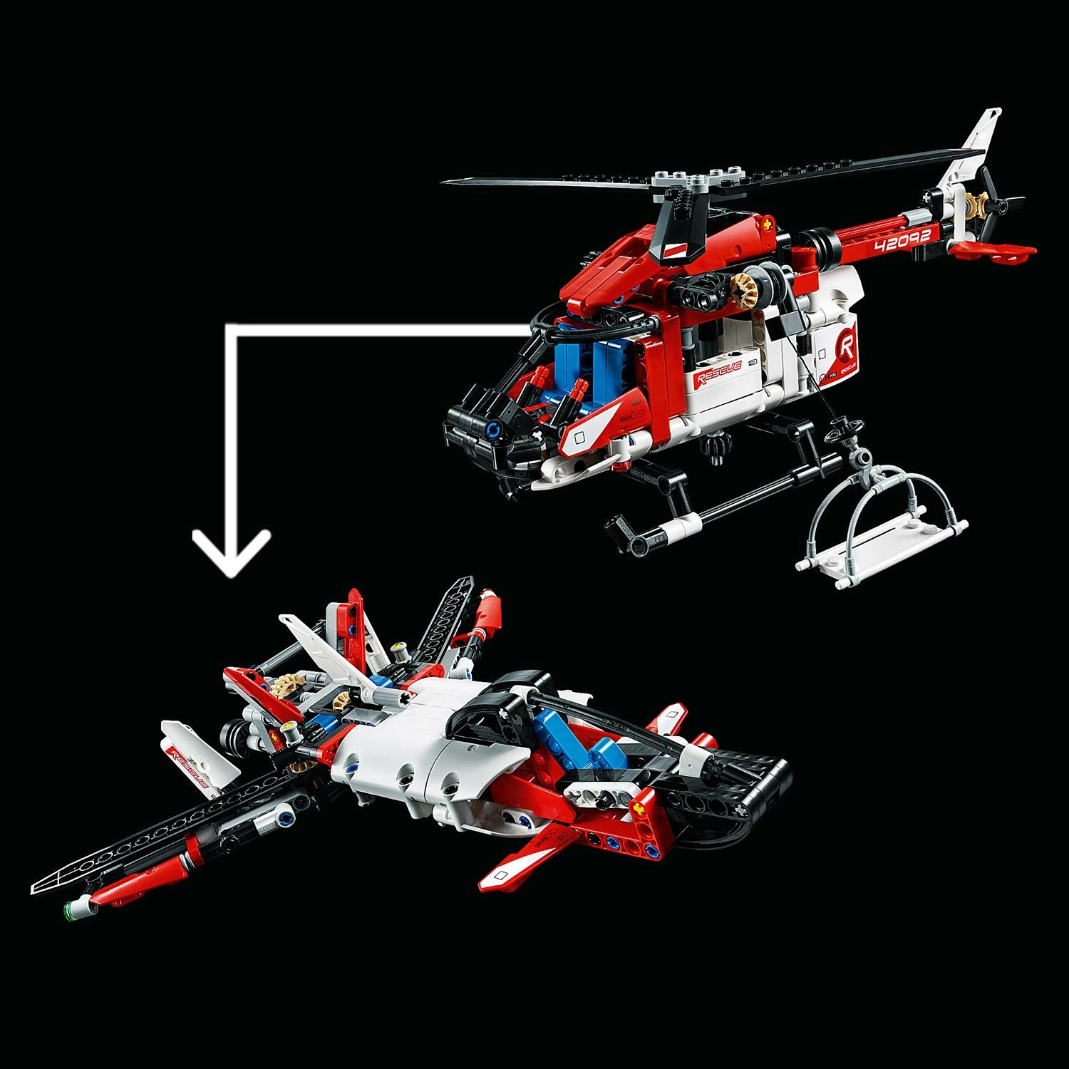 Utilisez l'hélicoptère de secours LEGO Technic 2-in-1 42092, avec un éventail de caractéristiques et de fonctions réalistes, notamment des rotors qui tournent, des portes latérales et arrière qui s’ouvrent, un treuil qui fonctionne et une civière de secours. Cet hélicoptère LEGO Technic robuste est agrementé de rouge, blanc et noir authentiques et peut être transformé en avion futuriste pour créer une double expérience de construction et de jeu !