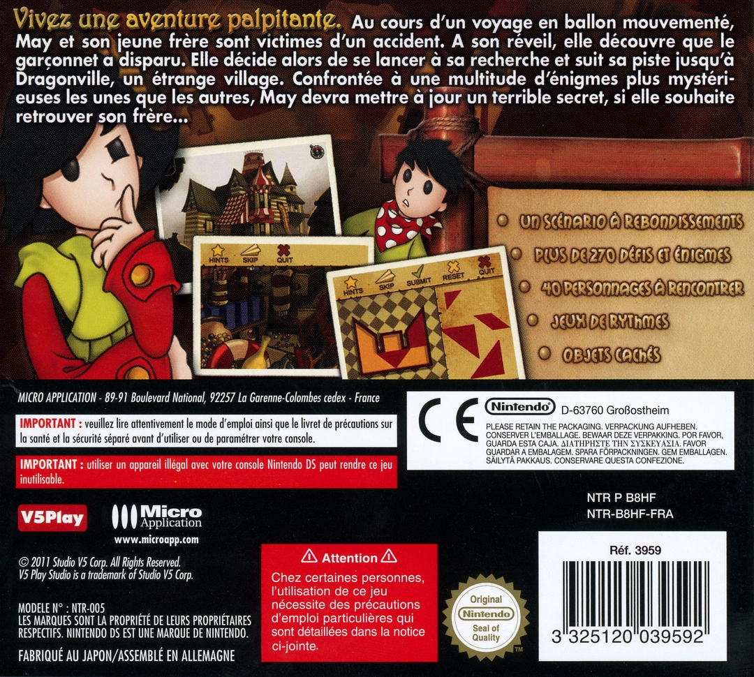 Les Aventures de May : L'Etrange Disparition est un jeu d'aventure et d'énigmes à destination de la DS. Aidez la jeune May à retrouver son petit frère au coeur de la cité de Dragonville, en interrogeant les habitants et en résolvant 270 énigmes.