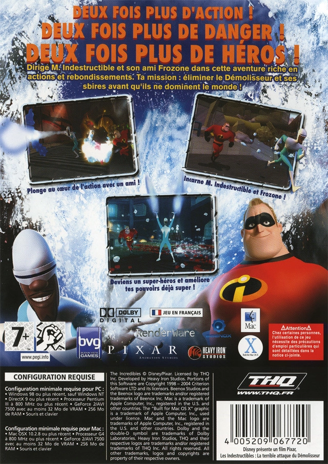 Les Indestructibles : La Terrible Attaque du Demolisseur sur PC est un jeu d'action qui constitue une sorte de suite au long métrage de Disney/Pixar. Affrontez-y un méchant inédit, le Démolisseur, et ses hordes de robots qu'il fait surgir du sol pour imposer sa loi. Incarnez Mr Indestructible et son ami Frozone à travers quinze niveaux et combattez treize types d'ennemis. Jouez à deux en même temps et débloquer des arènes pour des affrontements super héroïques.