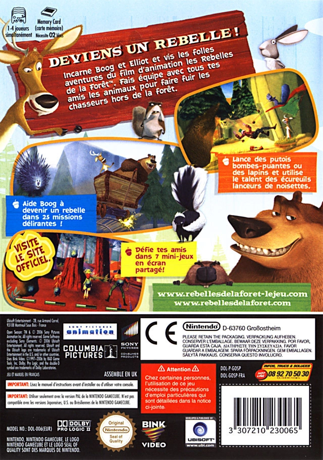 Les Rebelles de la Forêt sur GameCube est un jeu d'action-aventure tiré du premier film d'animation du studio Sony Pictures Animation. Boog, un grizzly habitué au confort de la civilisation et Elliot, un cerf à un bois têtu et trop bavard, se retrouvent perdus dans la forêt à 3 jours de l'ouverture de la chasse.