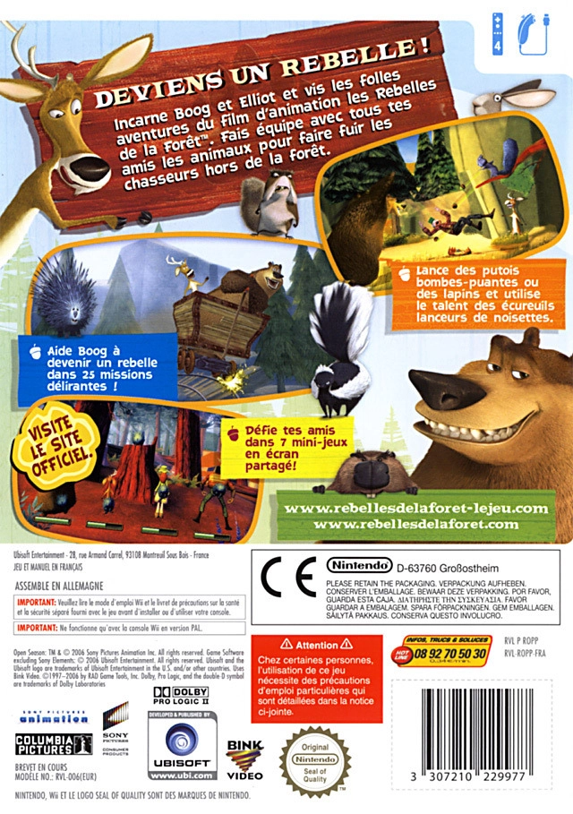 Les Rebelles de la Forêt sur Wii est un jeu d'action-aventure tiré du premier film d'animation du studio Sony Pictures Animation. Boog, un grizzly habitué au confort de la civilisation et Elliot, un cerf à un bois têtu et trop bavard, se retrouvent perdus dans la forêt à 3 jours de l'ouverture de la chasse. Libérez vos instincts et unissez les animaux de la forêt pour faire fuir les chasseurs hors de votre territoire.
