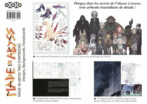 Plongez dans les secrets de l'Abysse à travers trois artbooks fourmillants de détails ! Des centaines d'illustrations et croquis détaillant la faune et les personnages de l'Abysse. L'intégralité des storyboards de la série, commentés par le réalisateur Masayuki Kojima. 196 pages de décors Osamu Masuyama, un vétéran du studio Ghibli !