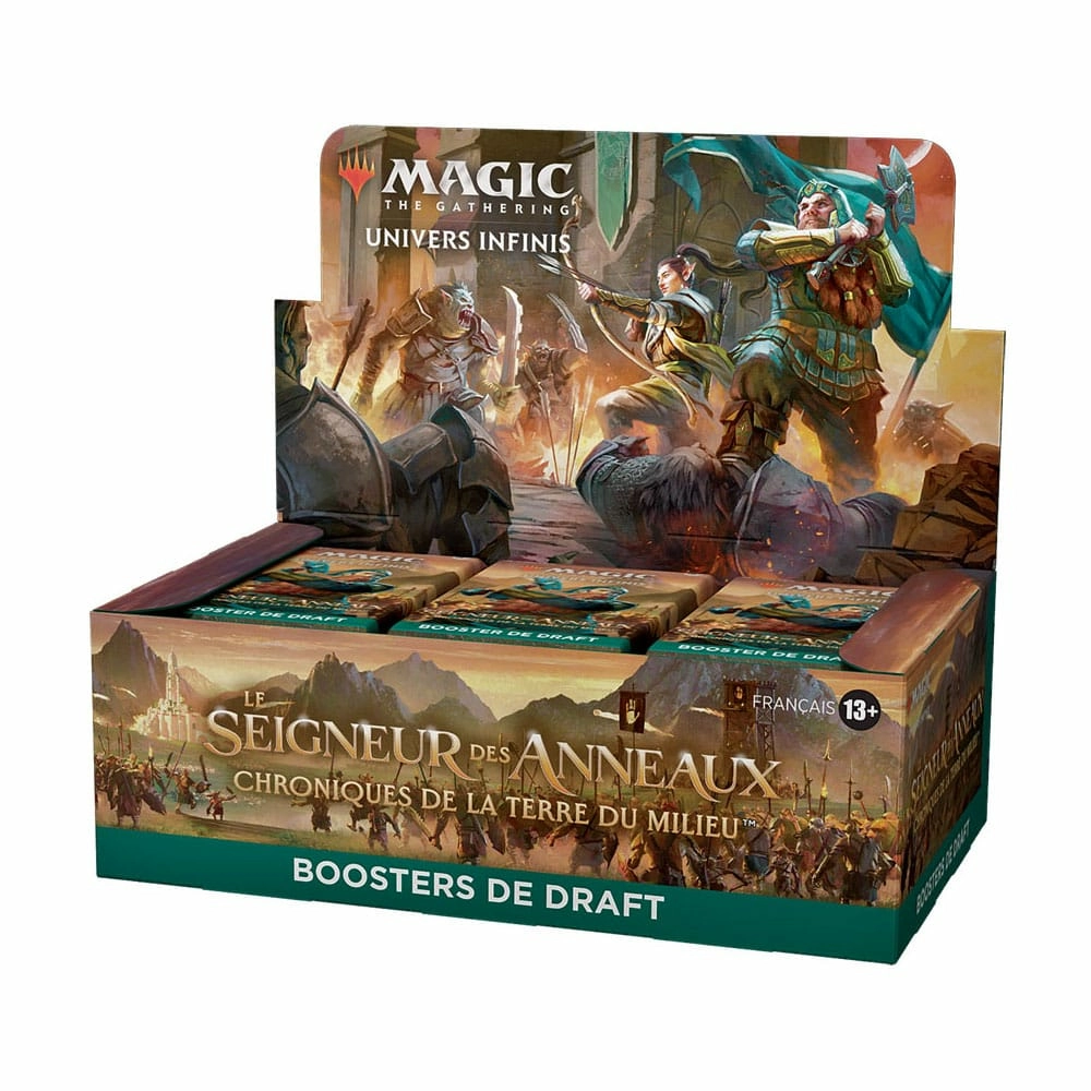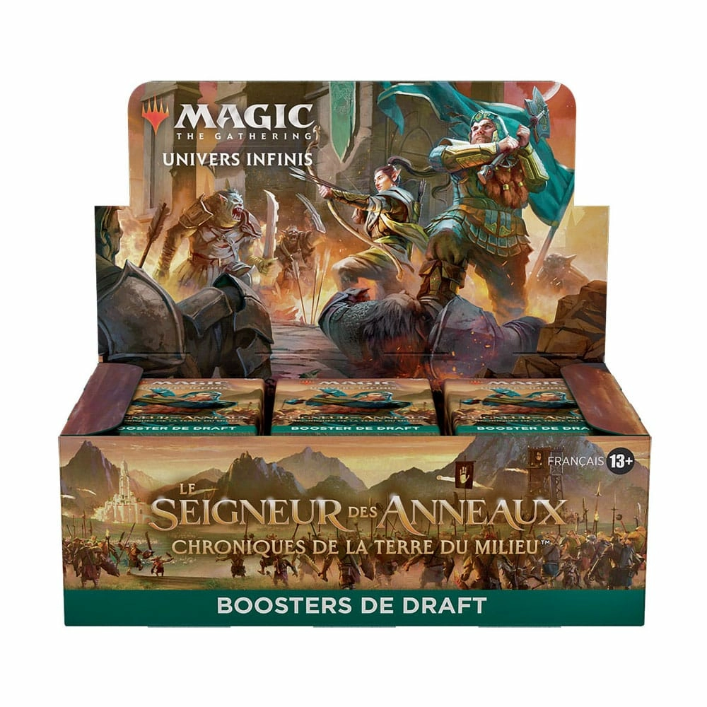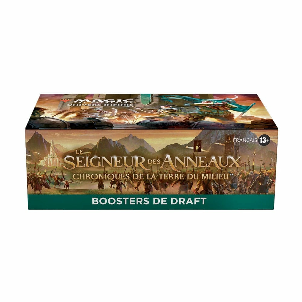 La boîte de boosters de draft Le Seigneur des Anneaux : chroniques de la Terre du milieu contient 36 boosters de draft Le Seigneur des Anneaux : chroniques de la Terre du milieu et 1 carte de présentation Premium traditionnelle. Chaque booster de draft contient 15 cartes et 1 carte publicitaire/de jeton ou d'aide, y compris 1 carte de rareté rare ou supérieure, 3 cartes inhabituelles, 10 cartes courantes et 1 carte de terrain. Une carte rare mythique sans bordure Premium traditionnelle dans