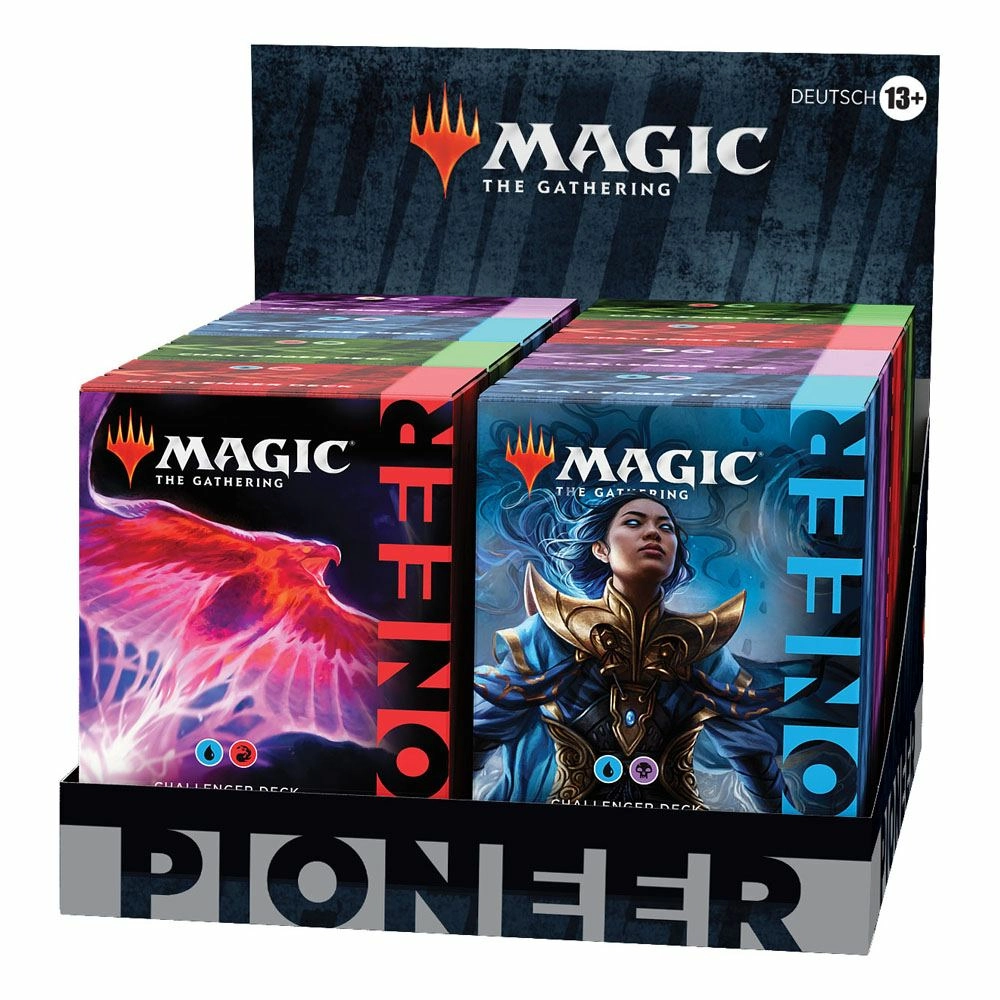 Chaque deck de 60 cartes (comprenant des terrains de base) est prêt-à-jouer et suffisamment puissant pour la compétition en format Pioneer. À chaque deck s'ajouteront une réserve de 15 cartes pour ajuster votre stratégie, 5 jetons recto-verso, 6 cartes d'aide à utiliser avec les cartes recto-verso et une boîte de deck (pouvant contenir 75 cartes avec protège-cartes).Présentoir de 8 Decks. Chaque deck contient :- 1 Challenger Deck Pioneer prêt-à-jouer de 60 cartes MTG- 1 réserve de 15 cartes- 5 jetons recto-verso et 6 cartes d'aide- 1 boîte de deck (pouvant contenir 75 cartes Magic avec protège-cartes)