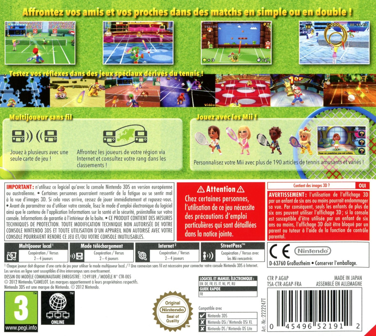 Mario Tennis Open est un jeu de tennis sur 3DS. Proposant des matches jouables jusqu'à 4 en ligne ou en local, le jeu fait intervenir une douzaine de personnages issus de l'univers Nintendo.