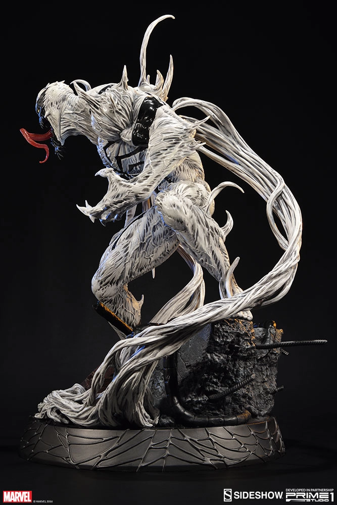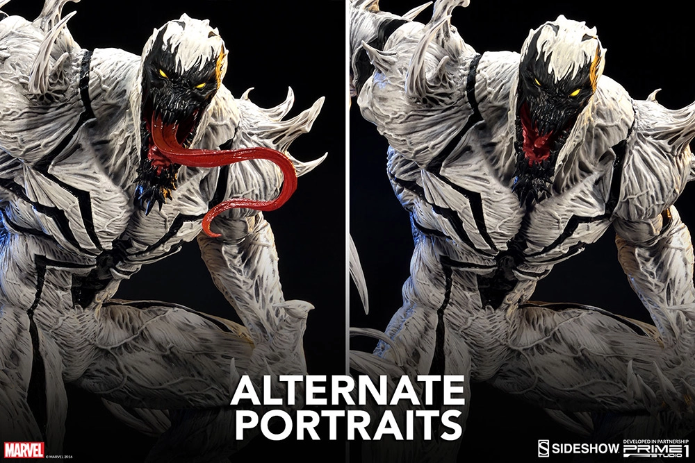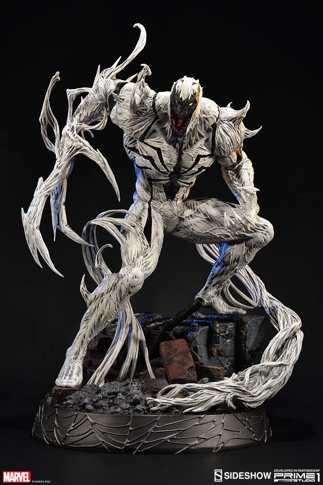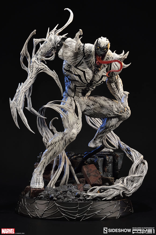 Développée et fabriquée en partenariat avec Prime 1 Studio, nous sommes fiers de vous présenter Anti-Venom. Quand le lien entre Eddie Brock et le symbiote Venom a été cassé, des traces sont restées dans son corps. Plus tard, souffrant d'un cancer, Brock est devenu volontaire dans le centre F.E.A.S.T. Martin Li, l'alter-ego de Mr. Negative, et fondateur du F.E.A.S.T. Utilisa ses pouvoirs pour guérir le cancer d'Eddie. Pendant la procédure, il mélangez accidentellement les restes du symbiote avec le sang d'Eddie et les fusionna avec ses globules blancs, créant un nouveau symbiote hybride qui se manifesta quand le symbiote Venom essaya de quitter son hôte du moment pour retourner dans Eddie. Ce nouveau symbiote à des grandes capacités de guérison et d'autres pouvoirs qui diffèrent du Venom original, produisant des anticorps qui peuvent guérir n'importe quelle maladie connue et retirer toutes les impuretés d'un corps humain. Contrairement aux autres symbiotes, celui-ci n'a pas de volonté propre et Eddie Brock contrôle complètement ses actions. Ce symbiote fut détruit quand il fut utilisé pour soigner le Spider-Virus.
