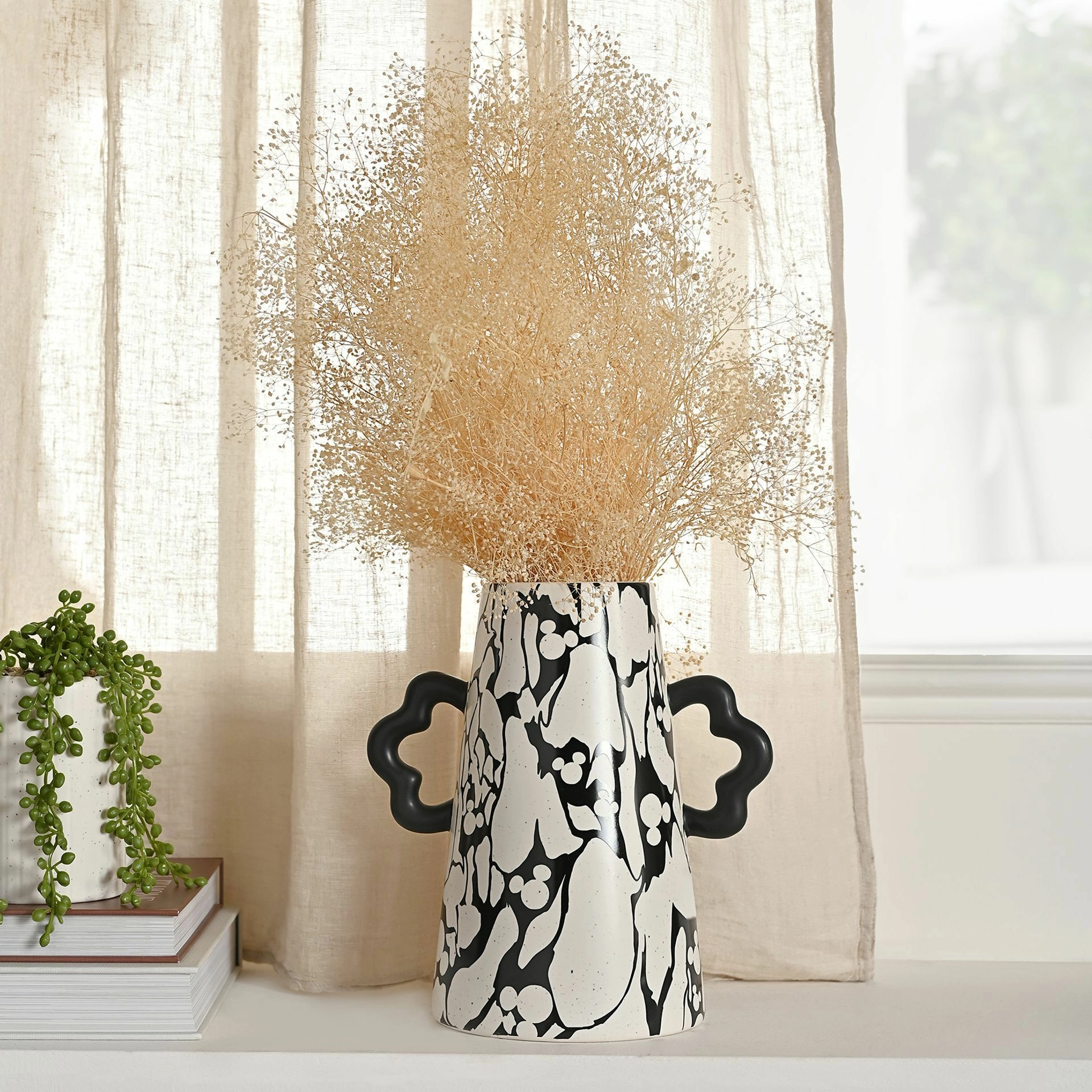Grand vase Mickey de Disney avec poignées. Un design moderne pour un classique de Disney. Une excellente façon de célébrer la magie de Disney.Fabriqué en céramique avec une finition mouchetée, le design contemporain exsude l'originalité avec des images emblématiques de la tête de Mickey. Avec leurs poignées en forme d'oreilles, ces objets font sensation.Fait partie de la collection sous licence officielle Disney Home, Mickey Shapes.
