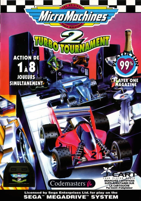 Micro Machines 2 : Turbo Tournament est un jeu de courses sur Megadrive. La cartouche du jeu met à votre disposition deux ports manettes supplémentaires, ce qui permet à huit joueurs de s'affronter sur le même écran (deux par manette). Le jeu vous met aux volants des fameux bolides miniatures et le but est d'arriver premier en prenant soin de distancer les autres joueurs pour leur faire perdre des points.