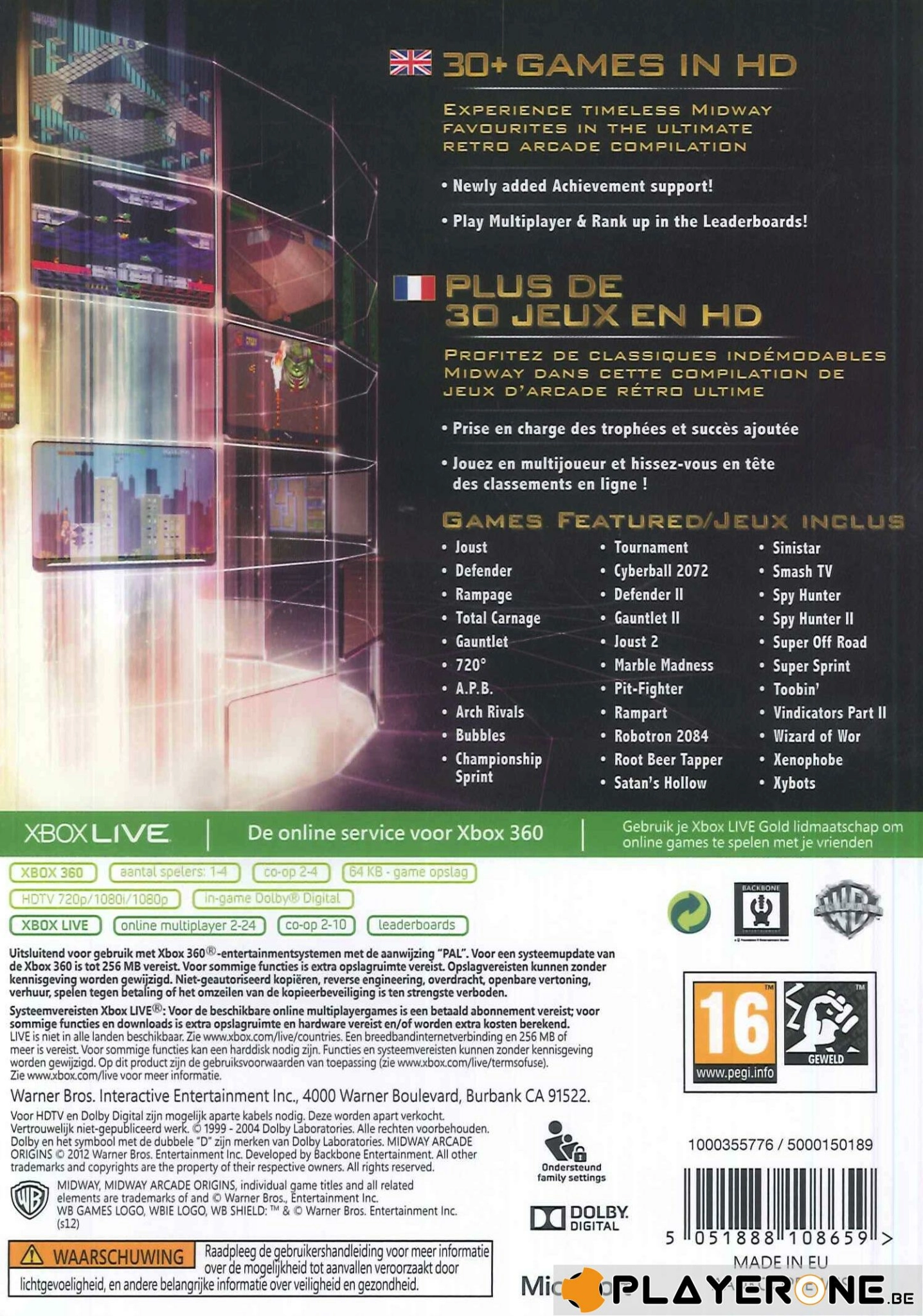 Midway Arcade Origins sur Xbox 360 est une compilation de 31 anciens titres. On y retrouve des jeux comme Gauntlet, Rampage, Joust, Spy Hunter, Defender, Marble Madness. Les joueurs ont également la possibilité de jouer avec trois de leurs amis au maximum en mode local et en mode coop multijoueur, ainsi que de publier leurs meilleurs scores en ligne.