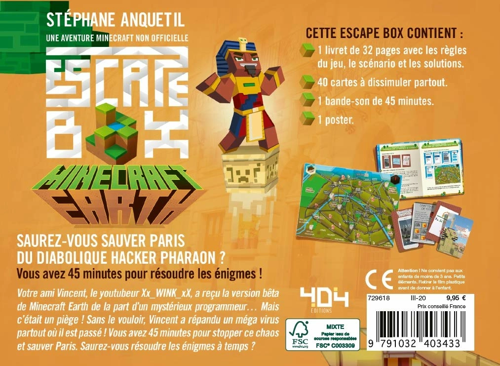 Votre ami Vincent, le youtubeur Xx_WINK_xX, a reçu la version bêta de Minecraft Earth de la part d'un mystérieux programmeur... Mais c'était un piège ! Sans le vouloir, Vincent a répandu un méga virus partout où il est passé ! Vous avez 45 minutes pour stopper ce chaos et sauver Paris. Saurez-vous résoudre les énigmes à temps ?Inclus : un poster et une bande-son de 45 minutes pour vous immerger dans l'ambiance !Idéal pour un anniversaire !