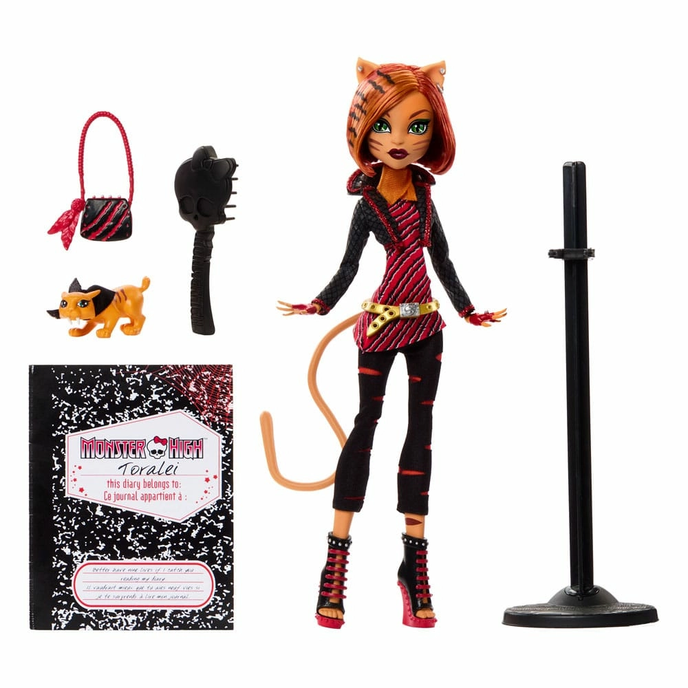 Les poupées Monster High originales reviennent avec des reproductions effrayantes des monstres préférés de tous! Sorti pour la première fois en 2011, Toralei dégage un style félinastrophiquement cool dans son habit rouge et noir caractéristique. Elle comprend son tigre à dents de sabre de compagnie Sweet Fangs, ainsi que d'horribles accessoires et 1 journal intime top secret. Cette poupée de collection constitue un cadeau idéal pour tous les fans de Monster High, ainsi que pour les enfants de 6 ans et plus! Support pour poupée inclus. La poupée ne peut pas tenir debout toute seule. Les couleurs et les motifs peuvent varier.